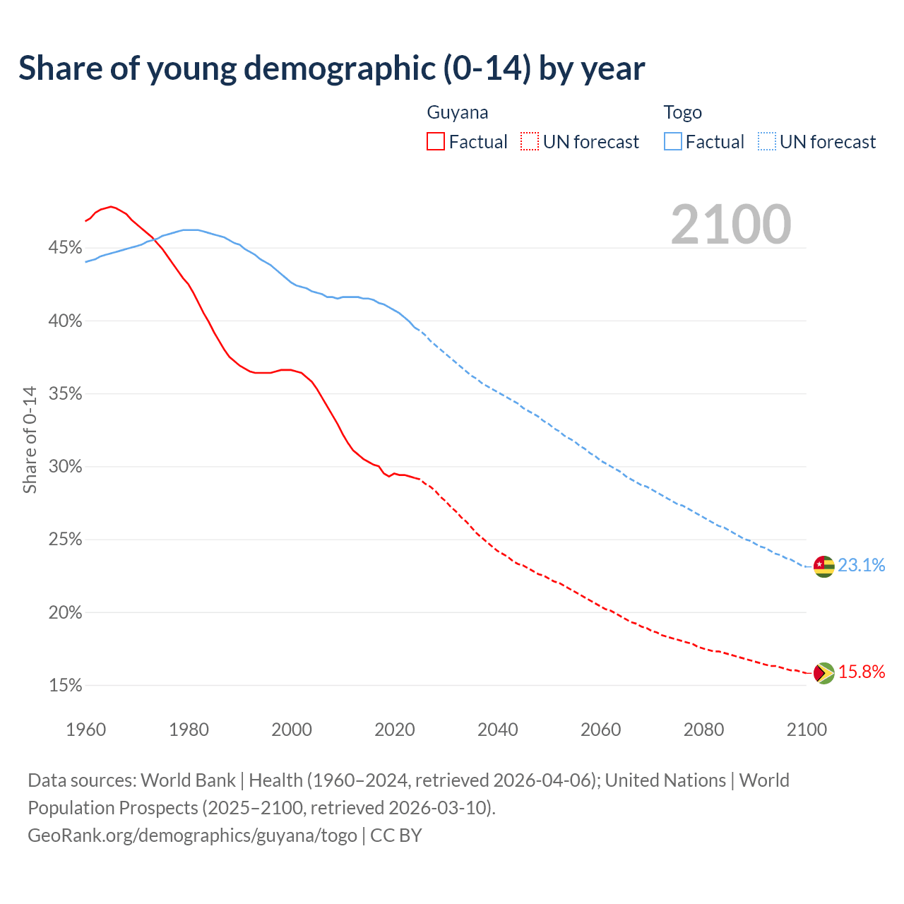 - The share of young demographic (0-15 years old) in Guyana is 29.2% vs 39.5% in Togo.