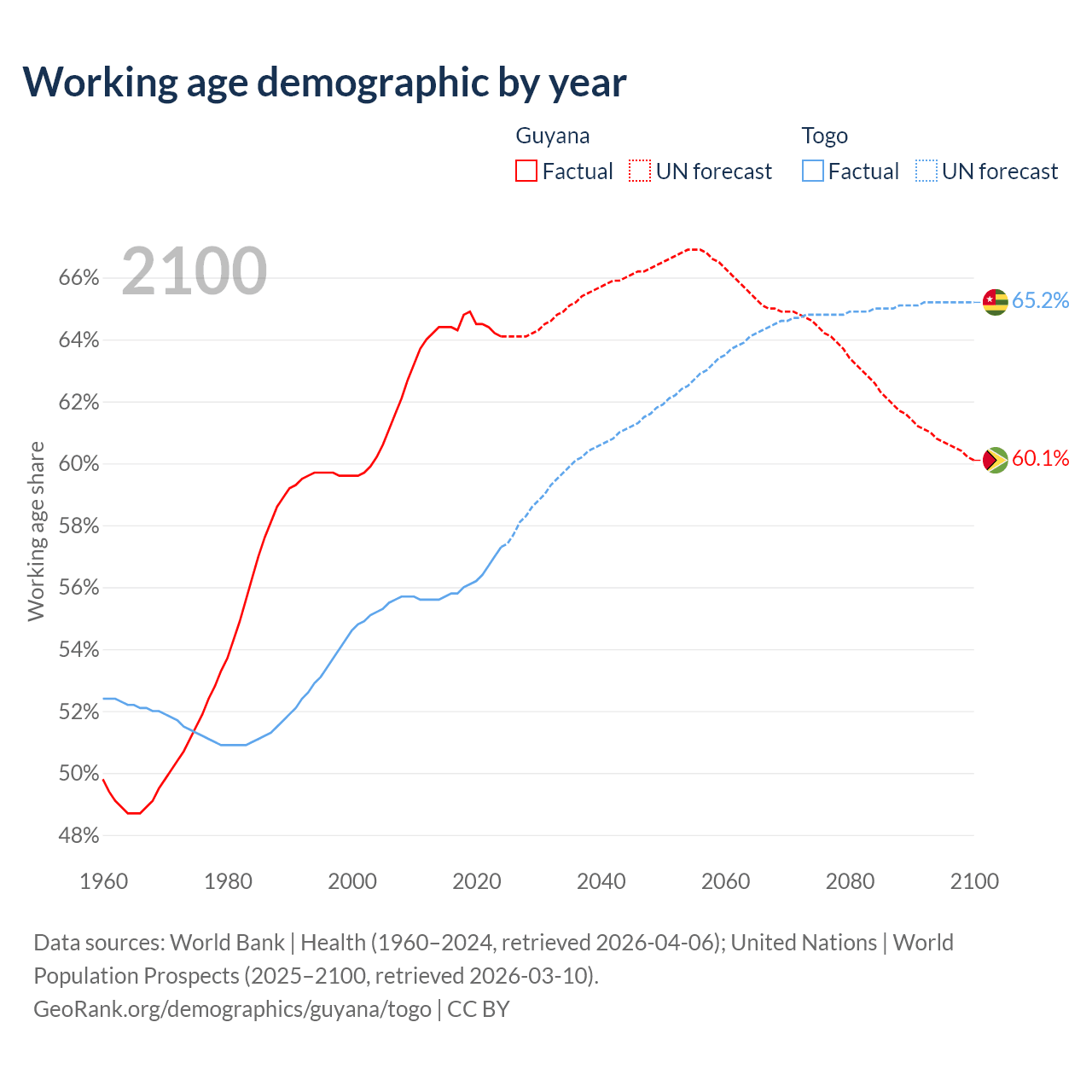 - The share of old-age demographic (65+) in Guyana is 6.73% vs 3.21% in Togo.