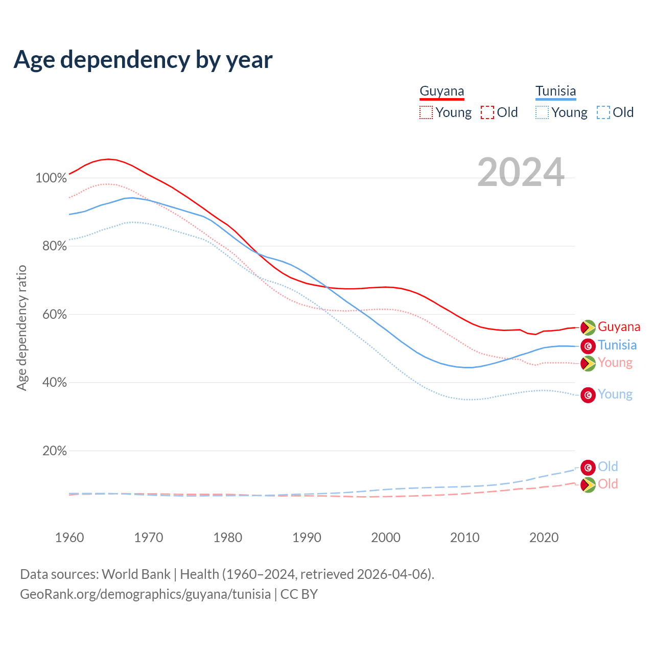 - Guyana is ranked 122/196 by median age (oldest to youngest) vs 86/196 for Tunisia.