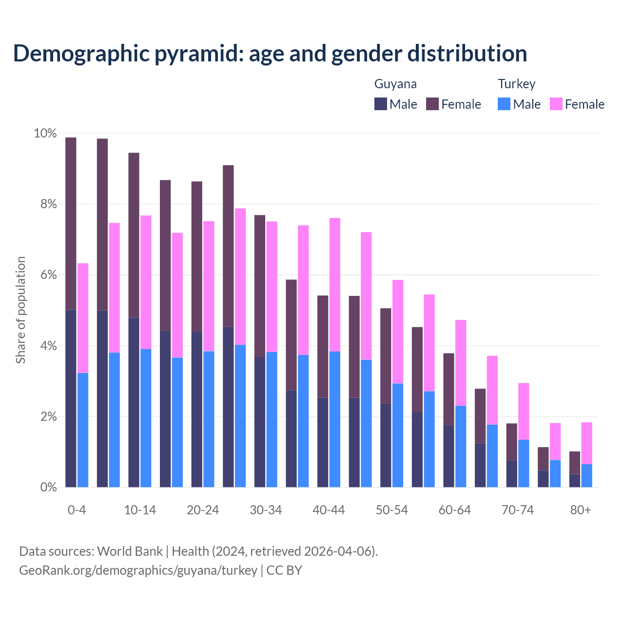 - Guyana is ranked 122/196 by median age (oldest to youngest) vs 83/196 for Turkey.