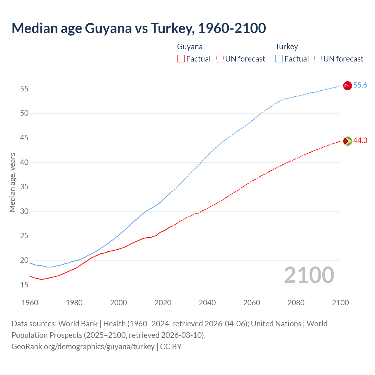- The median age in Guyana is 26.9 years compared to 34 years in Turkey.