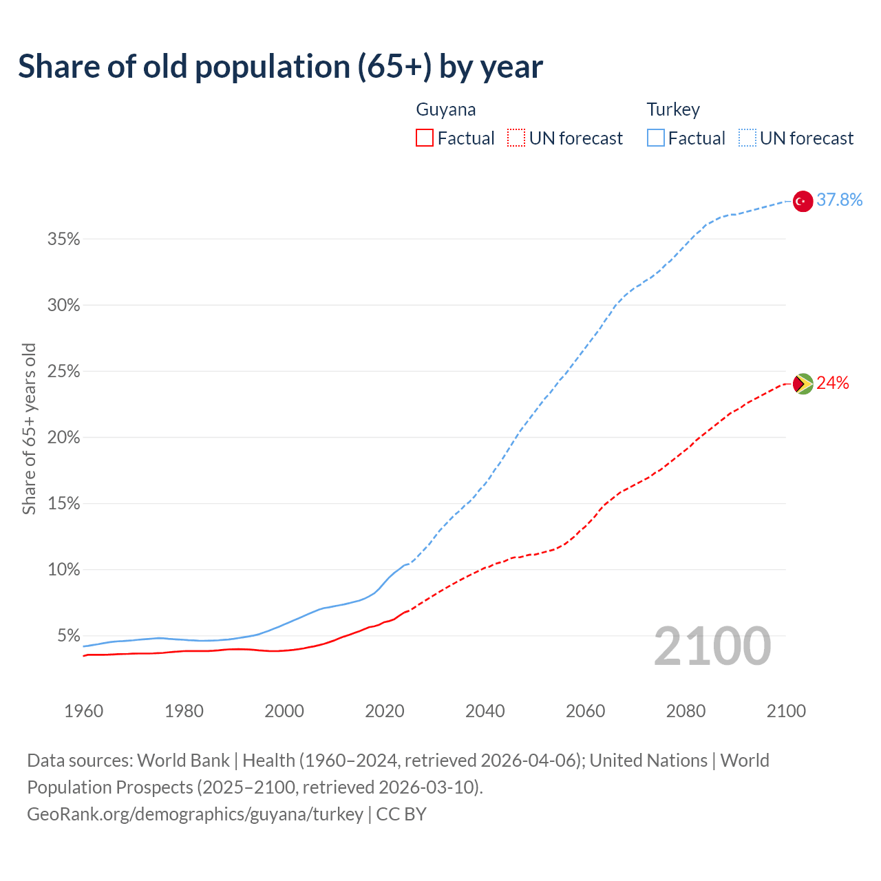 The share of older people aged 65 and over is 6.73% in Guyana and 10.3% in Turkey. Life expectancy in Guyana compared to Turkey .