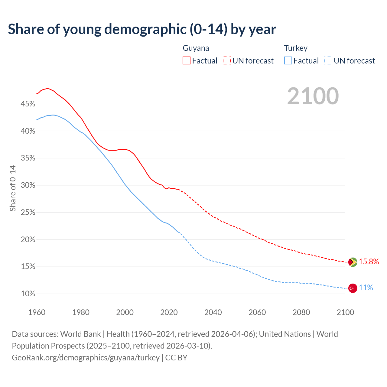 - The share of young demographic (0-15 years old) in Guyana is 29.2% vs 21.4% in Turkey.