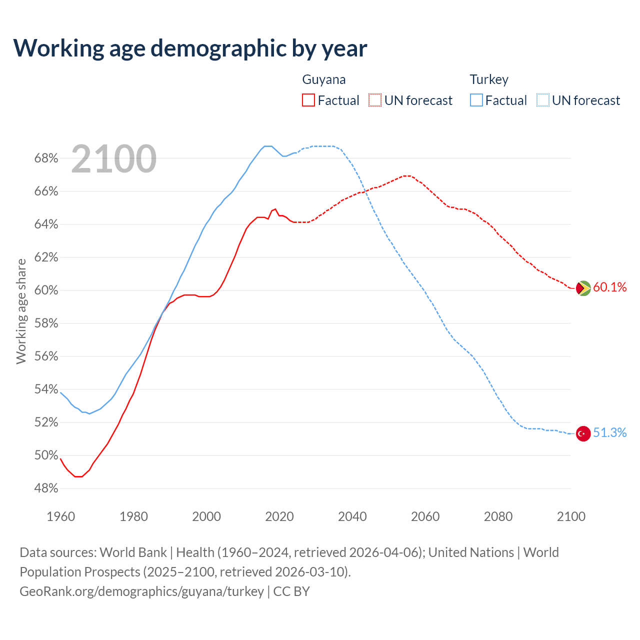 - Guyana has 540K working age adults (aged 15-64) vs 58.7M in Turkey.