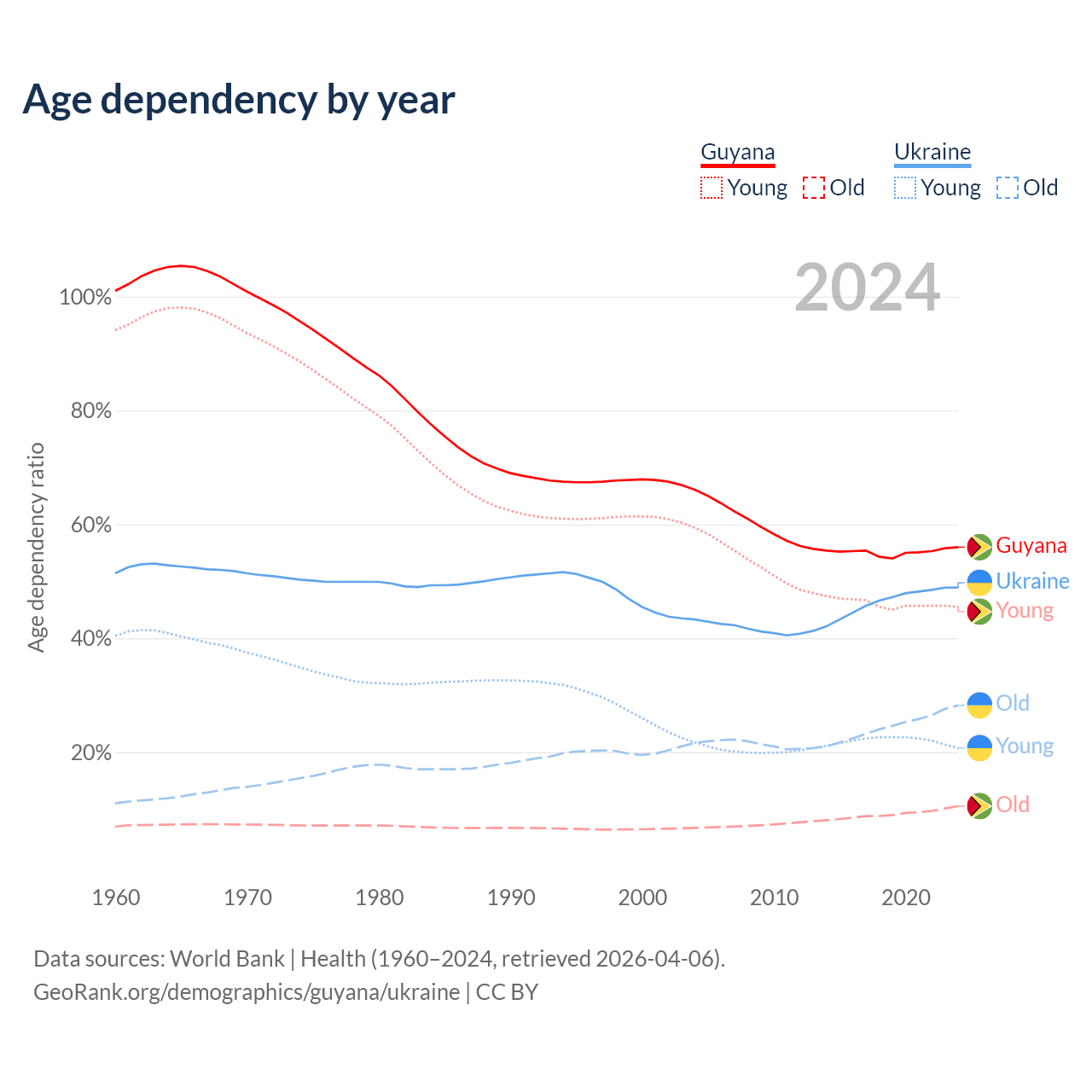 - The share of old-age demographic (65+) in Guyana is 6.73% vs 19% in Ukraine.