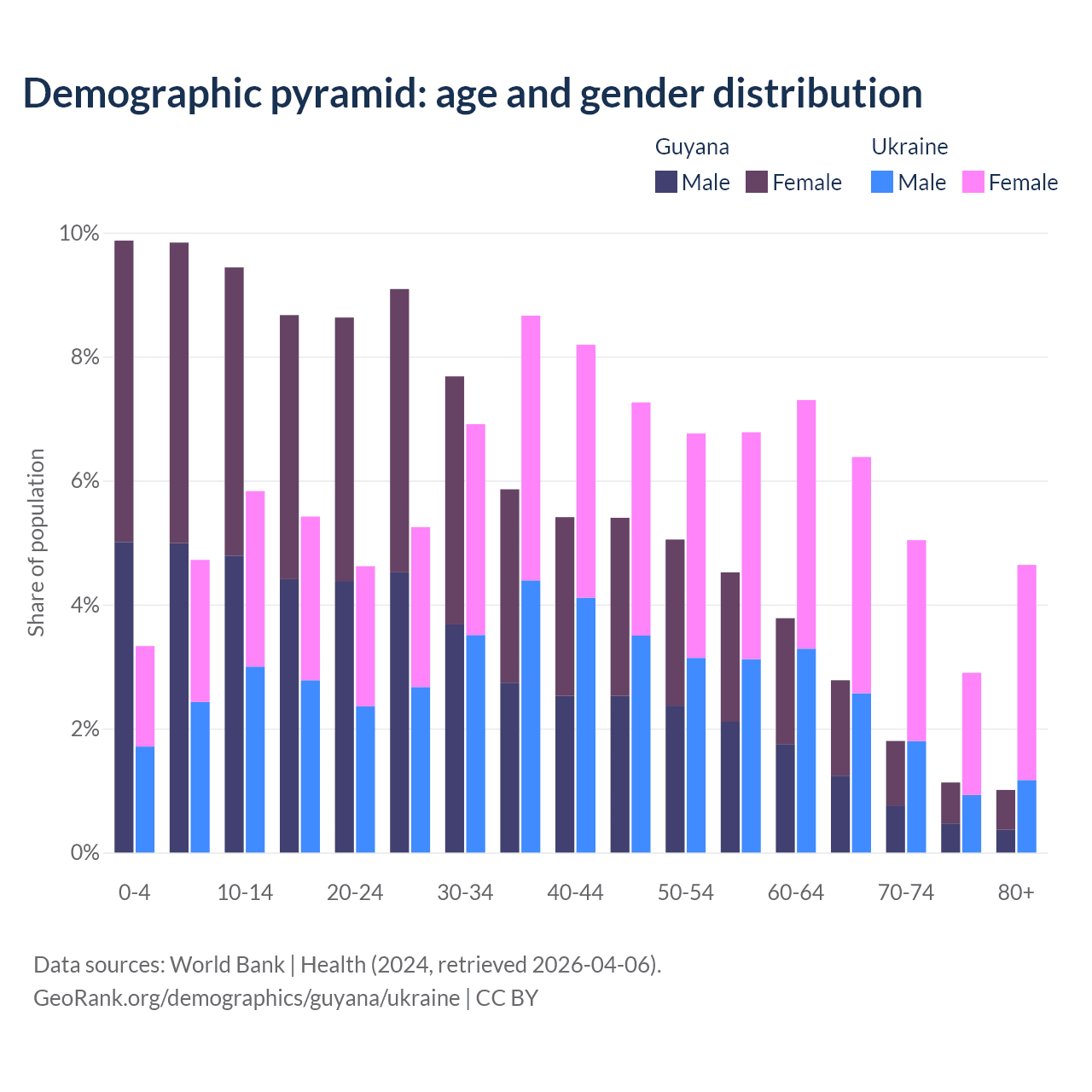 - Guyana is ranked 122/196 by median age (oldest to youngest) vs 26/196 for Ukraine.