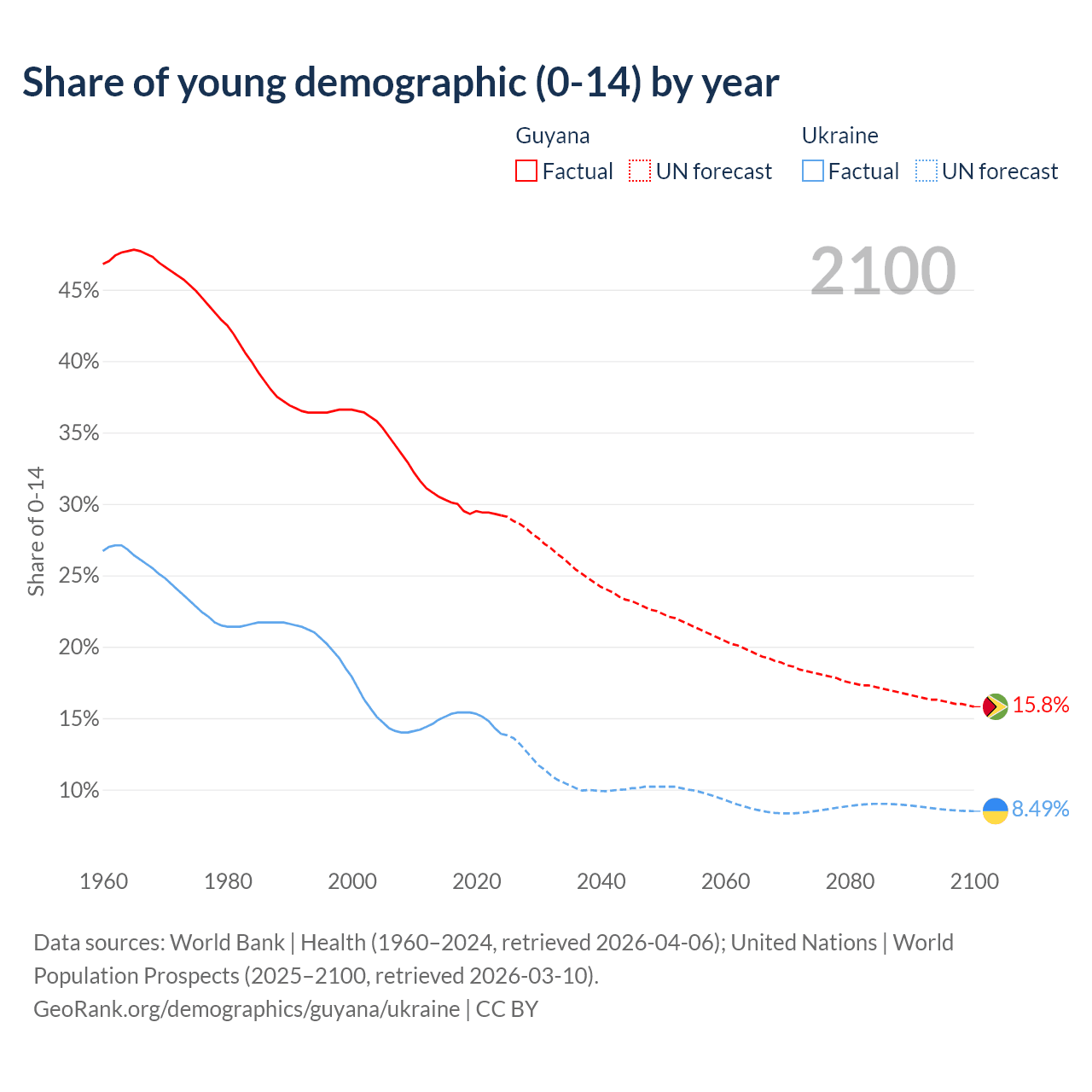 - The share of young demographic (0-15 years old) in Guyana is 29.2% vs 13.9% in Ukraine.