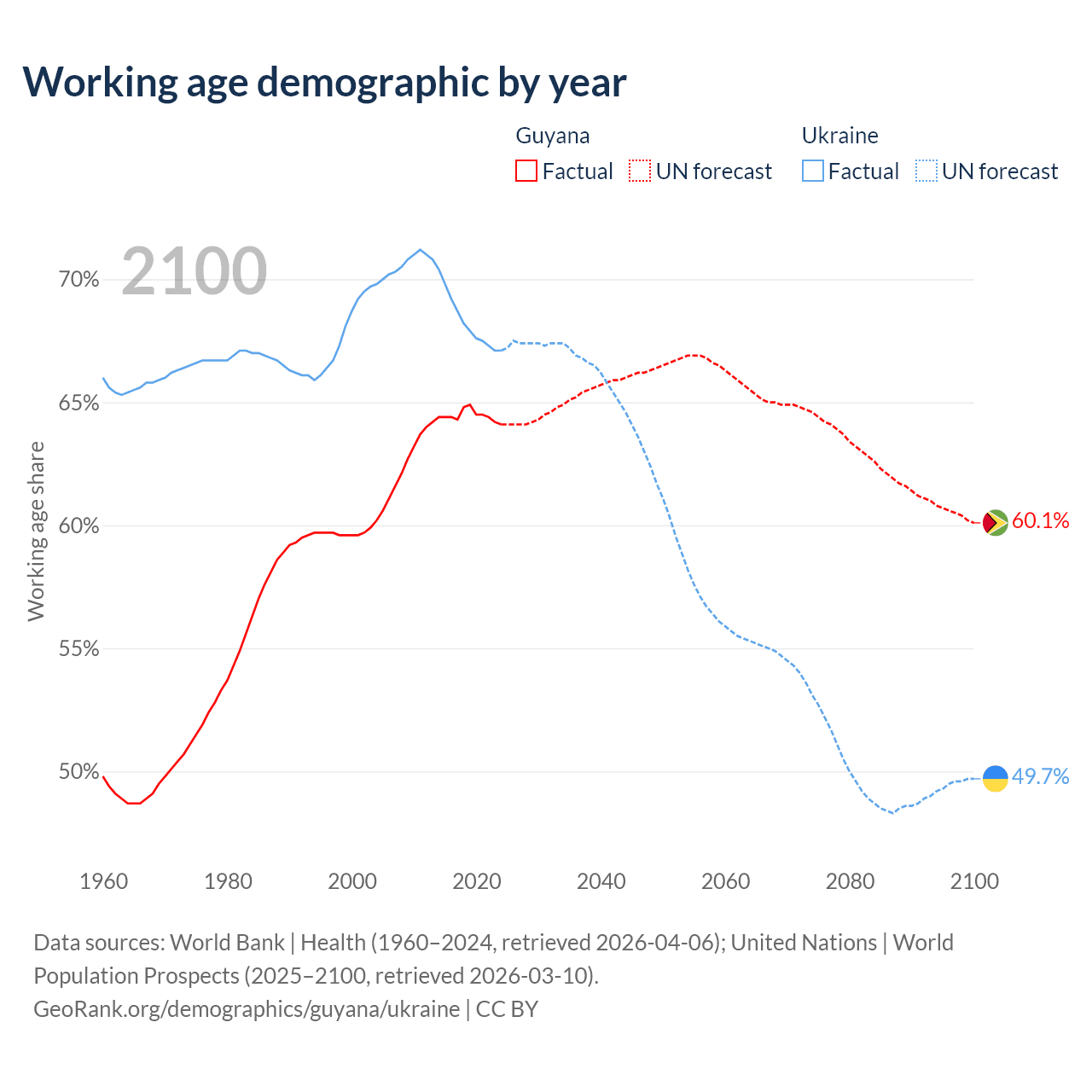 Median age Guyana vs Ukraine, 1960-2100