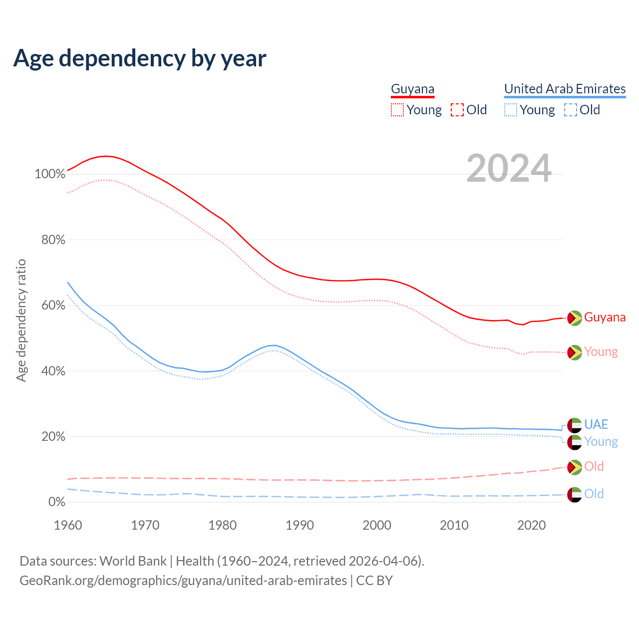 - Guyana is ranked 122/196 by median age (oldest to youngest) vs 91/196 for the United Arab Emirates.