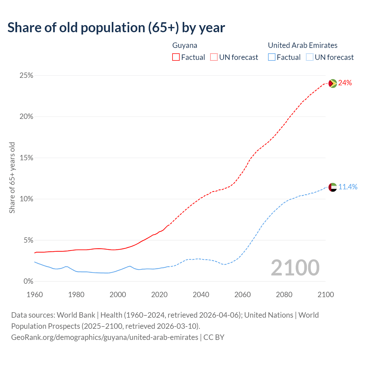 - The share of old-age demographic (65+) in Guyana is 6.73% vs 1.77% in the United Arab Emirates.