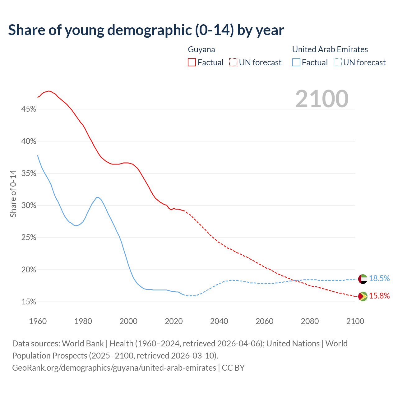 - The share of young demographic (0-15 years old) in Guyana is 29.2% vs 16.1% in the United Arab Emirates.