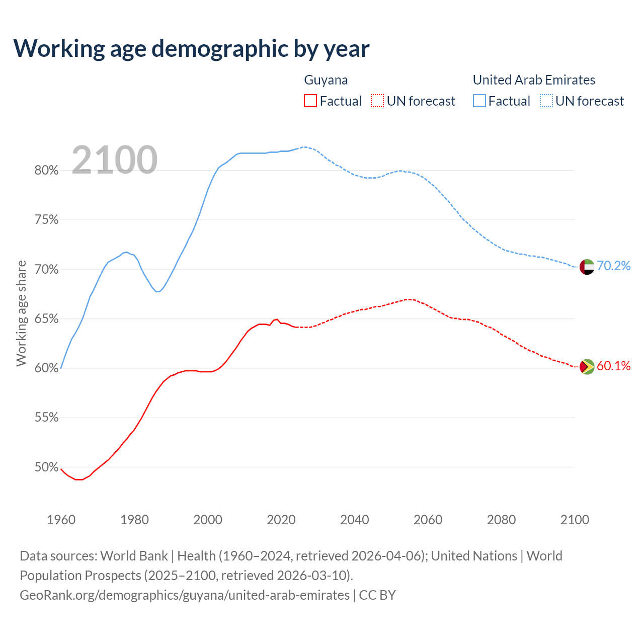 - Guyana has 540K working age adults (aged 15-64) vs 9.6M in the United Arab Emirates.