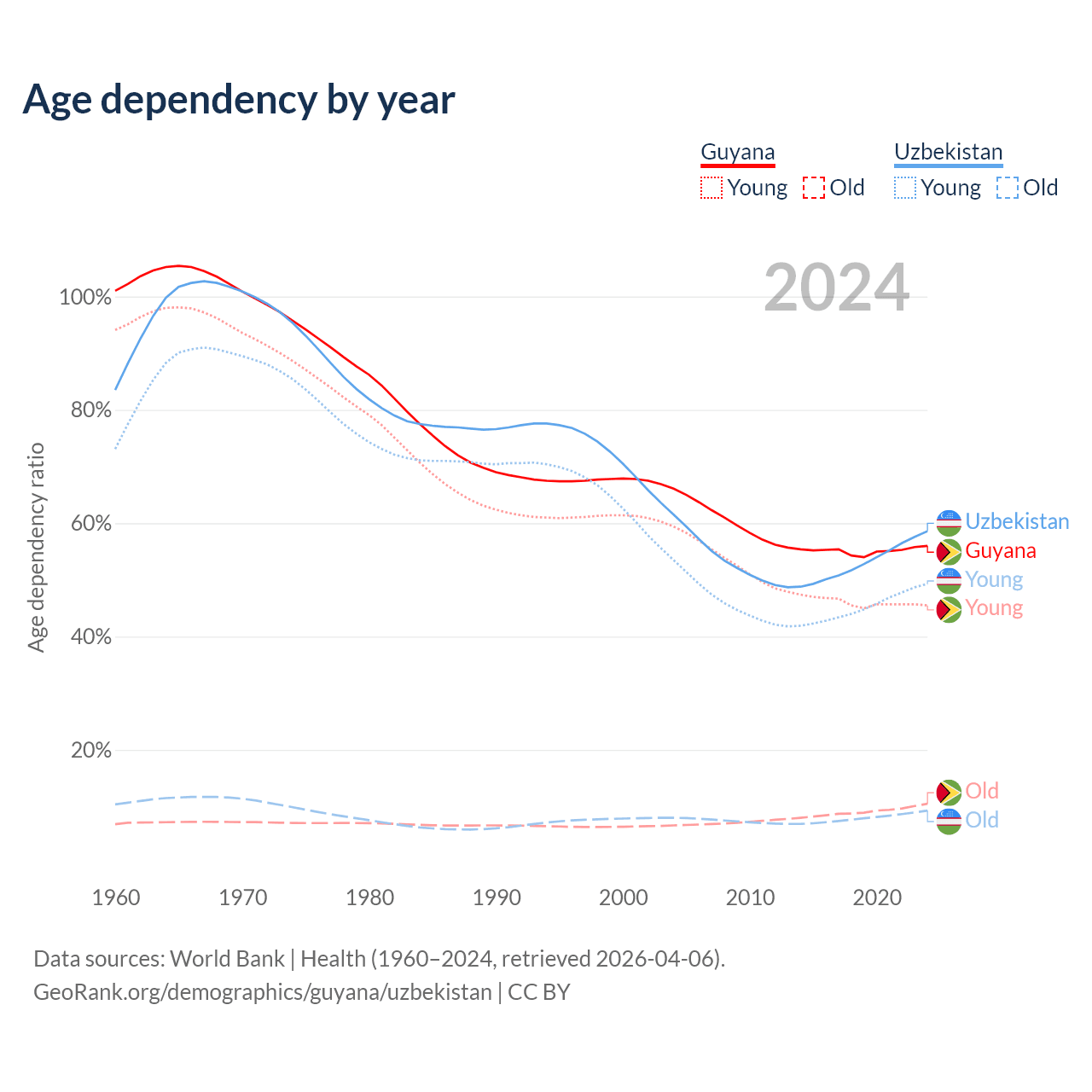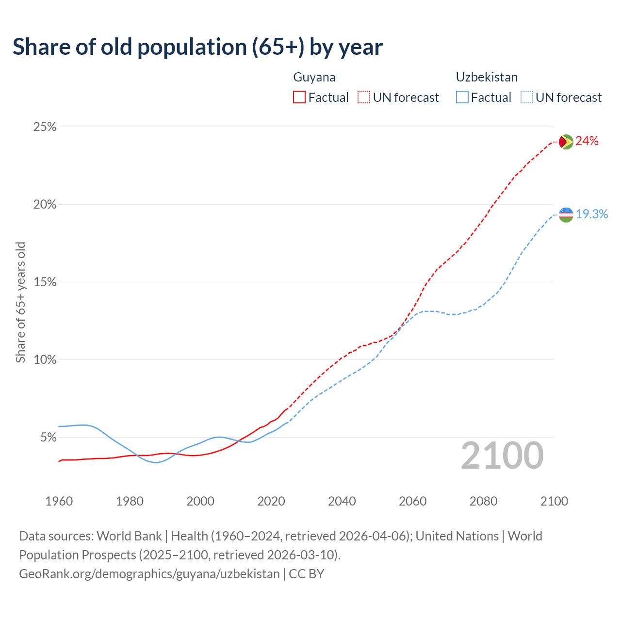 - The share of old-age demographic (65+) in Guyana is 6.73% vs 5.86% in Uzbekistan.