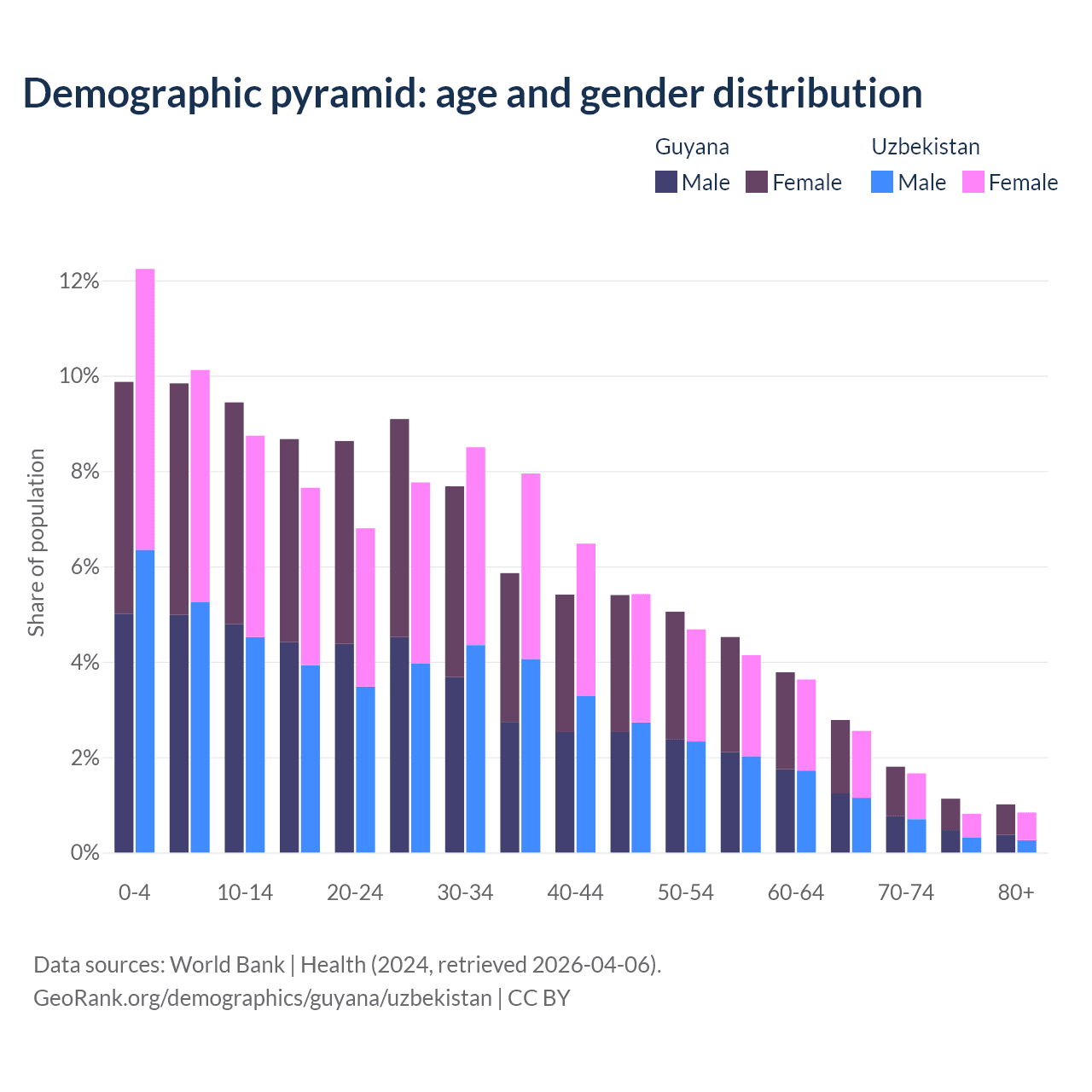 - As of 2026, the population of Guyana is 842K vs 37.9M in Uzbekistan - 45 times difference.