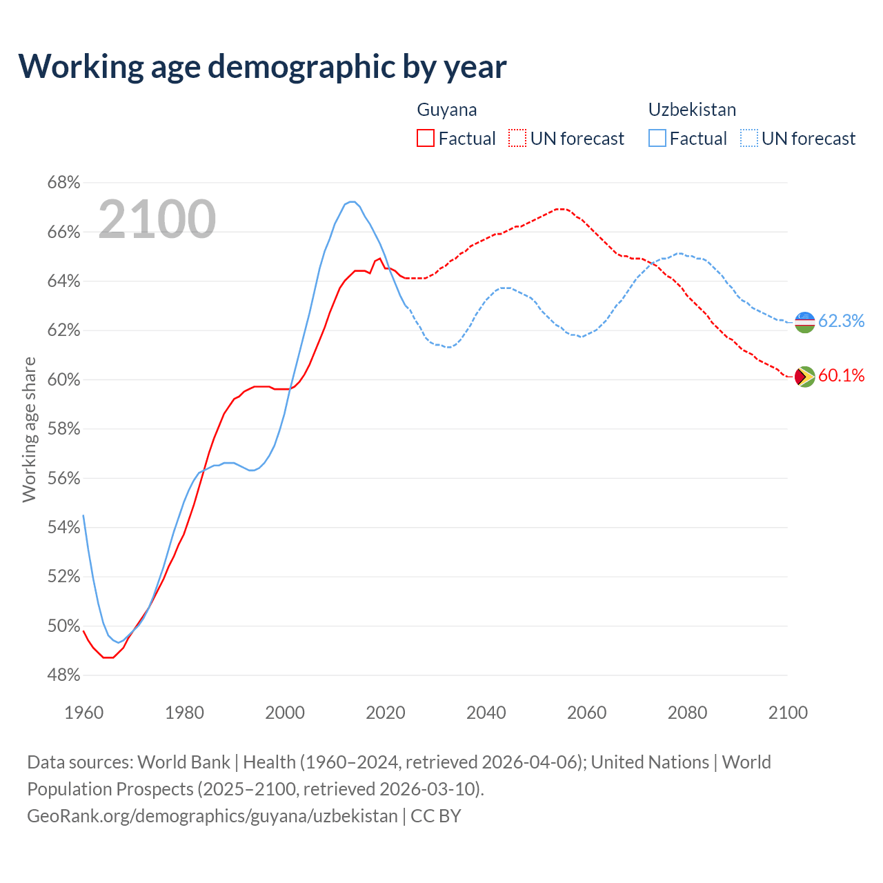- Guyana has 540K working age adults (aged 15-64) vs 23.9M in Uzbekistan.