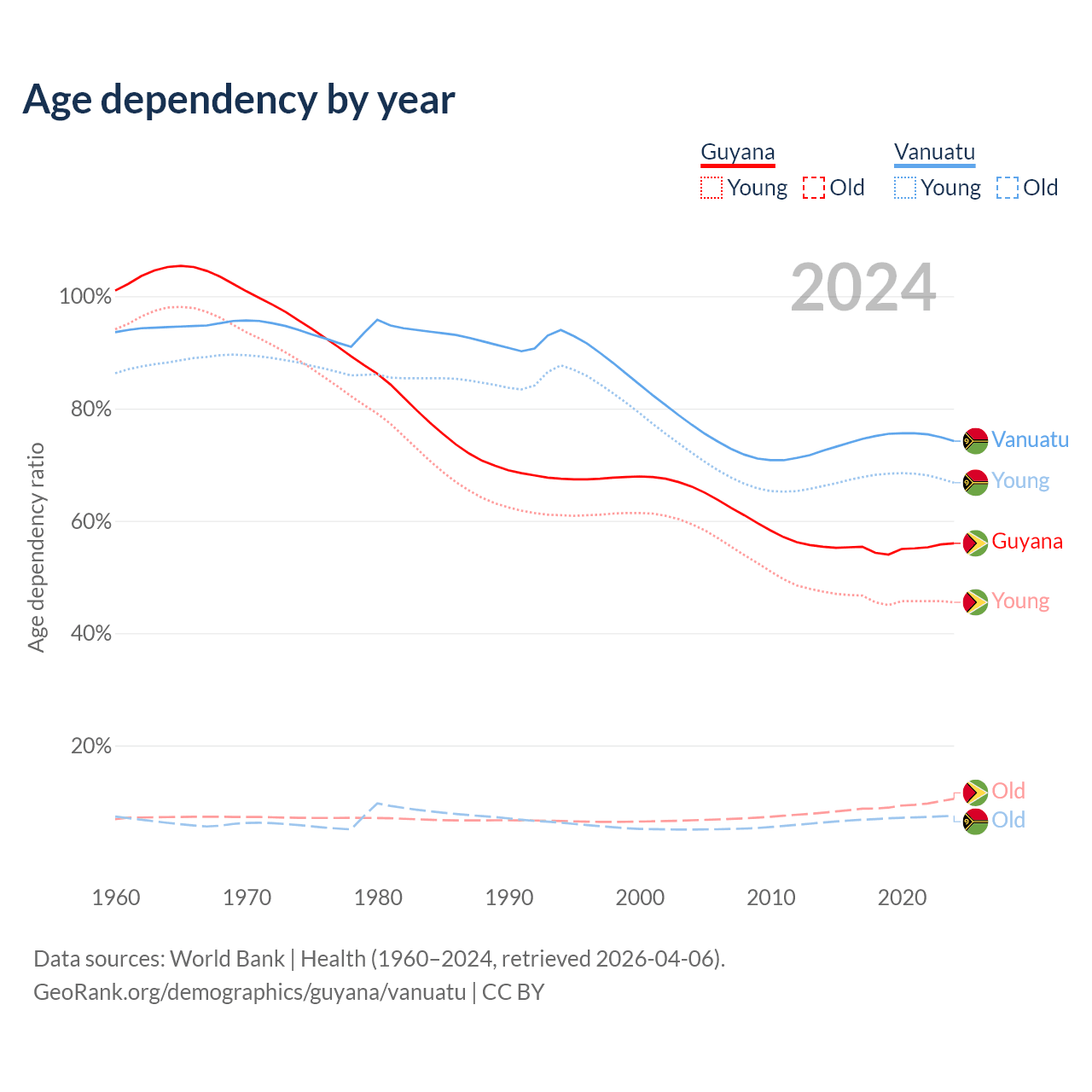 - Guyana is ranked 122/196 by median age (oldest to youngest) vs 156/196 for Vanuatu.