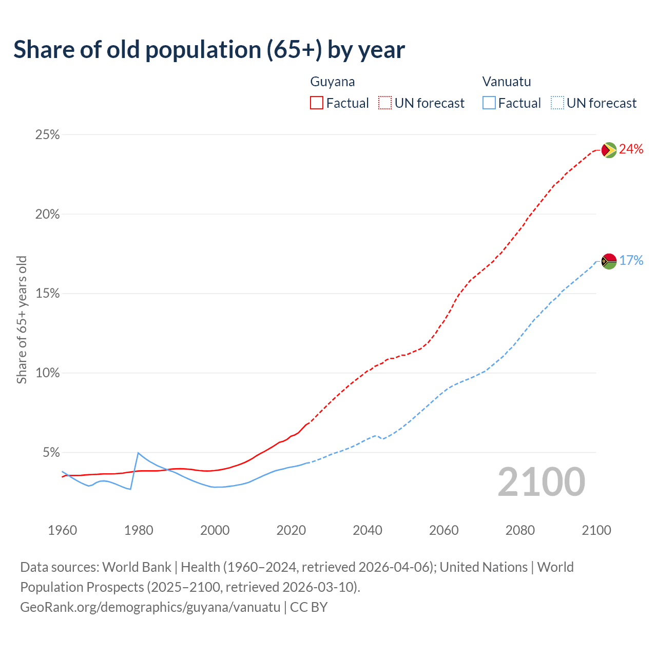 - The share of old-age demographic (65+) in Guyana is 6.73% vs 4.3% in Vanuatu.