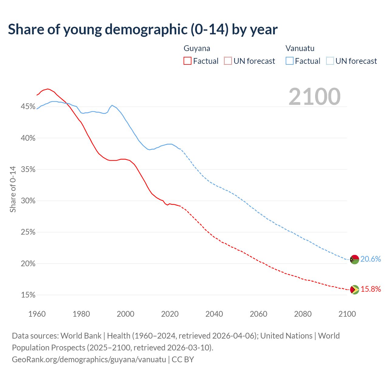 - The share of young demographic (0-15 years old) in Guyana is 29.2% vs 38.3% in Vanuatu.