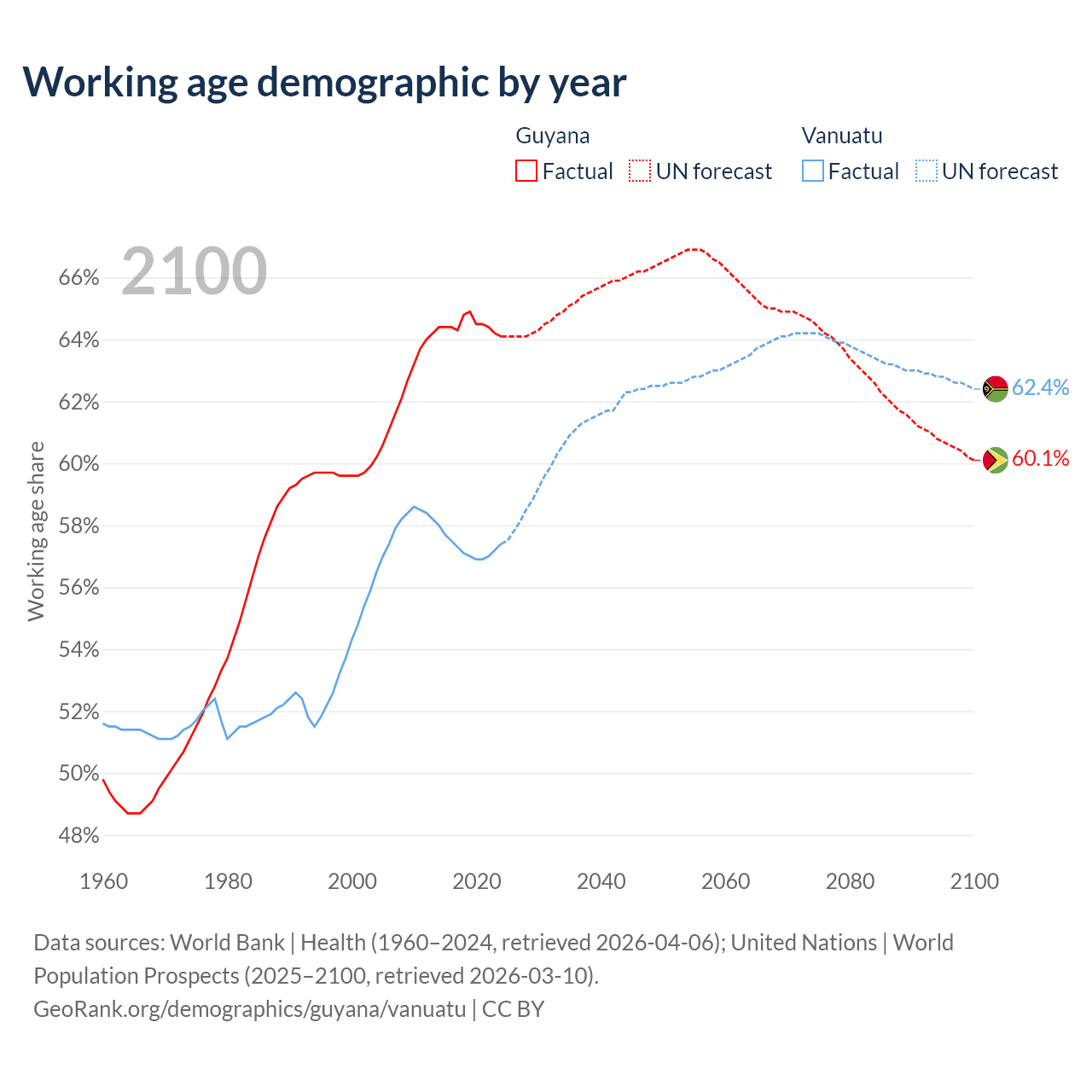 - Guyana has 540K working age adults (aged 15-64) vs 198K in Vanuatu.