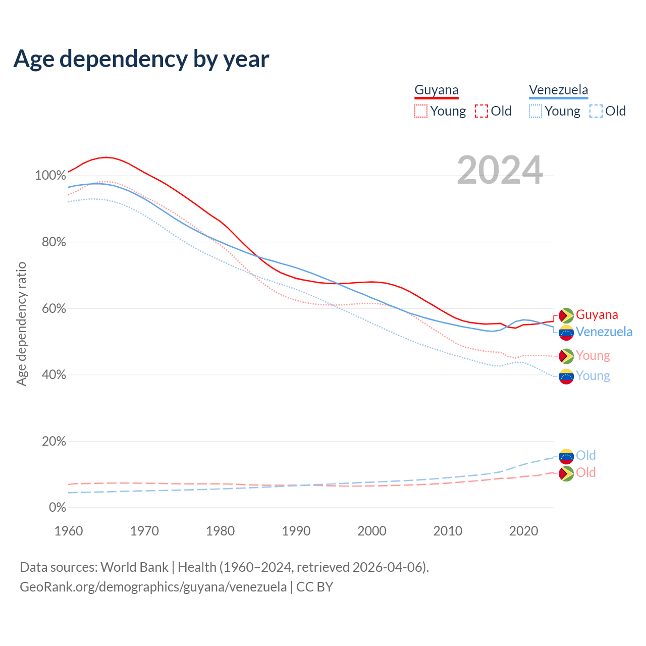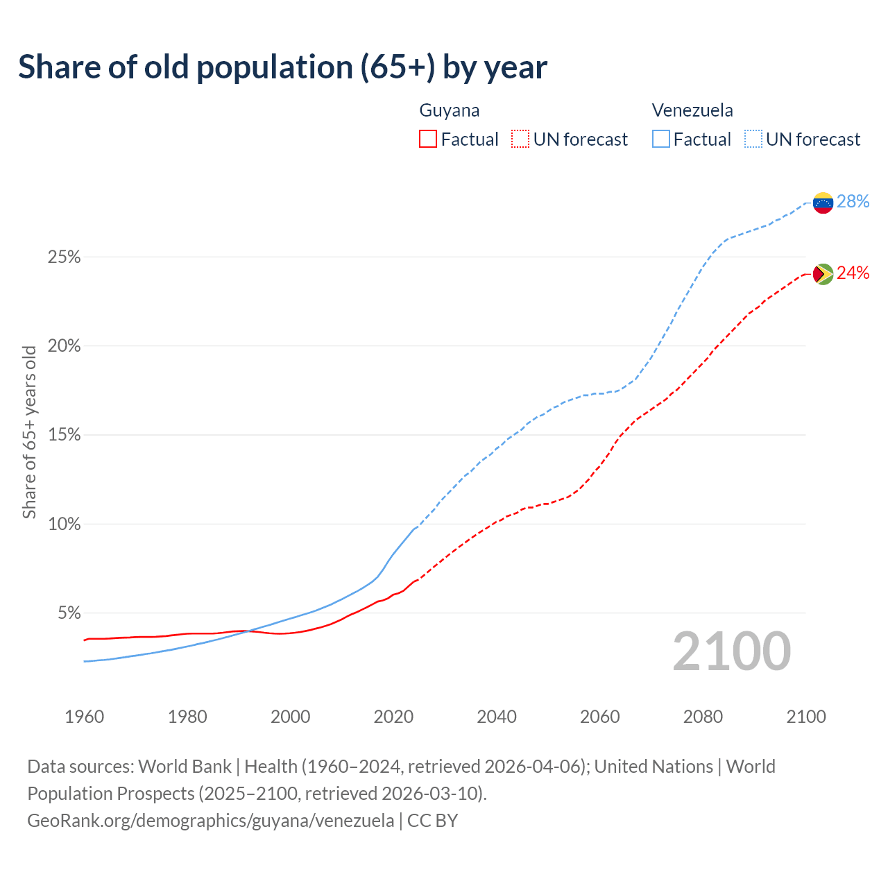 The share of older people aged 65 and over is 6.73% in Guyana and 9.68% in Venezuela. Life expectancy in Guyana compared to Venezuela .