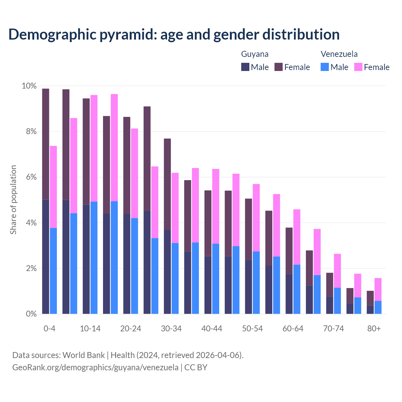 - The share of old-age demographic (65+) in Guyana is 6.73% vs 9.68% in Venezuela.