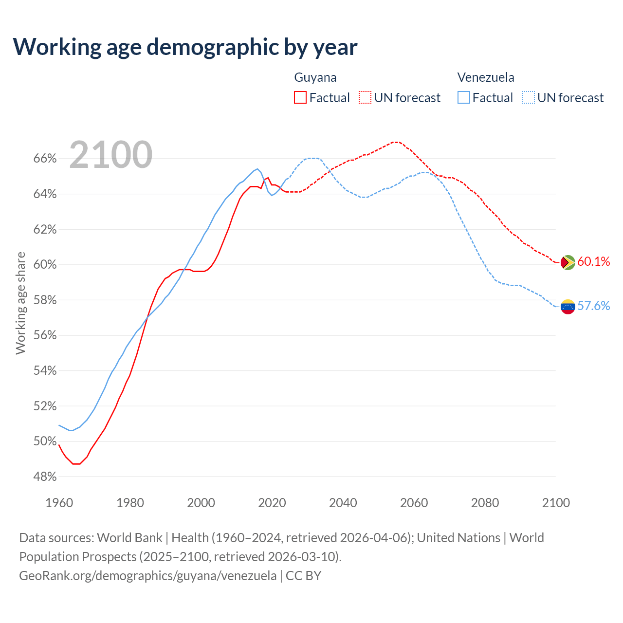 Median age Guyana vs Venezuela, 1960-2100