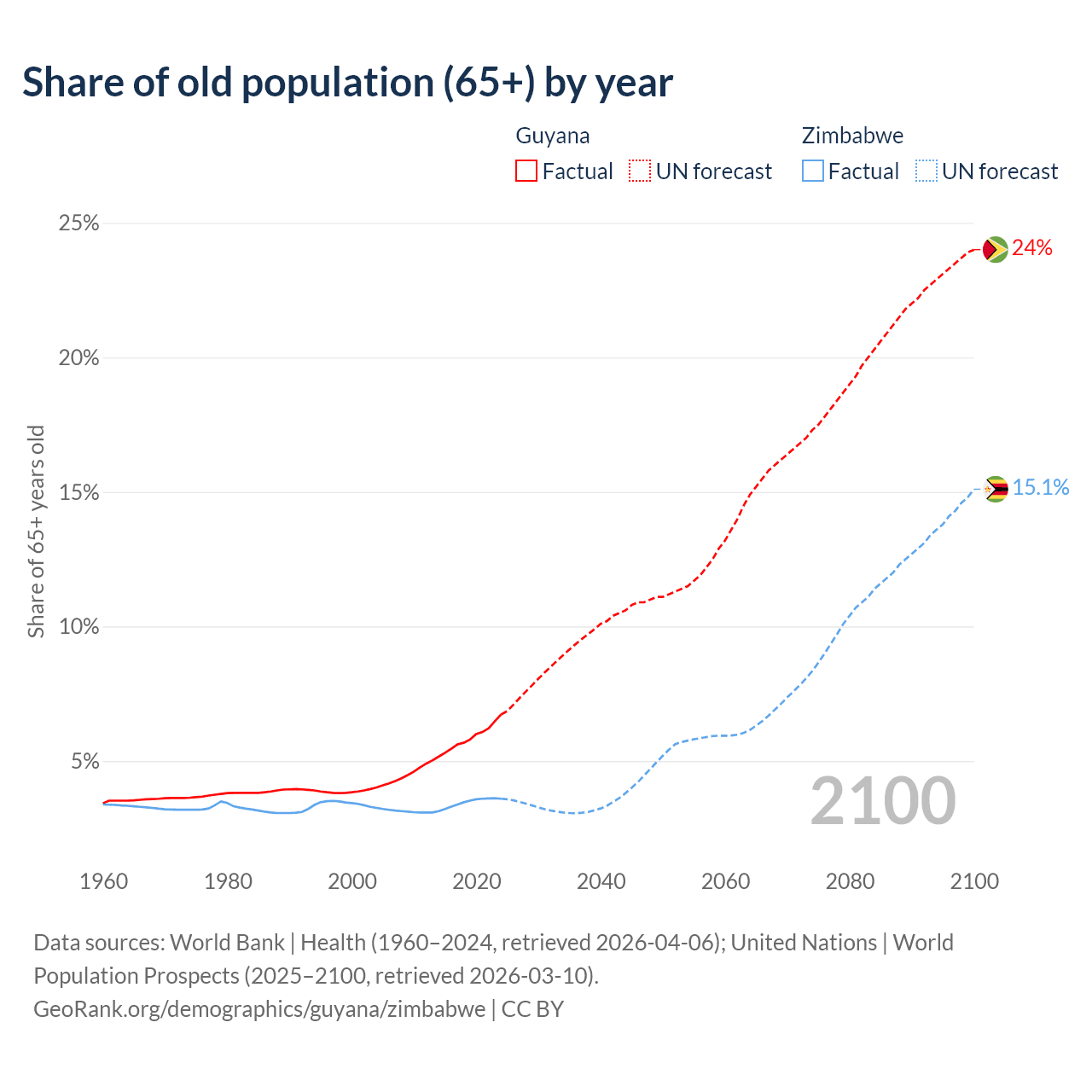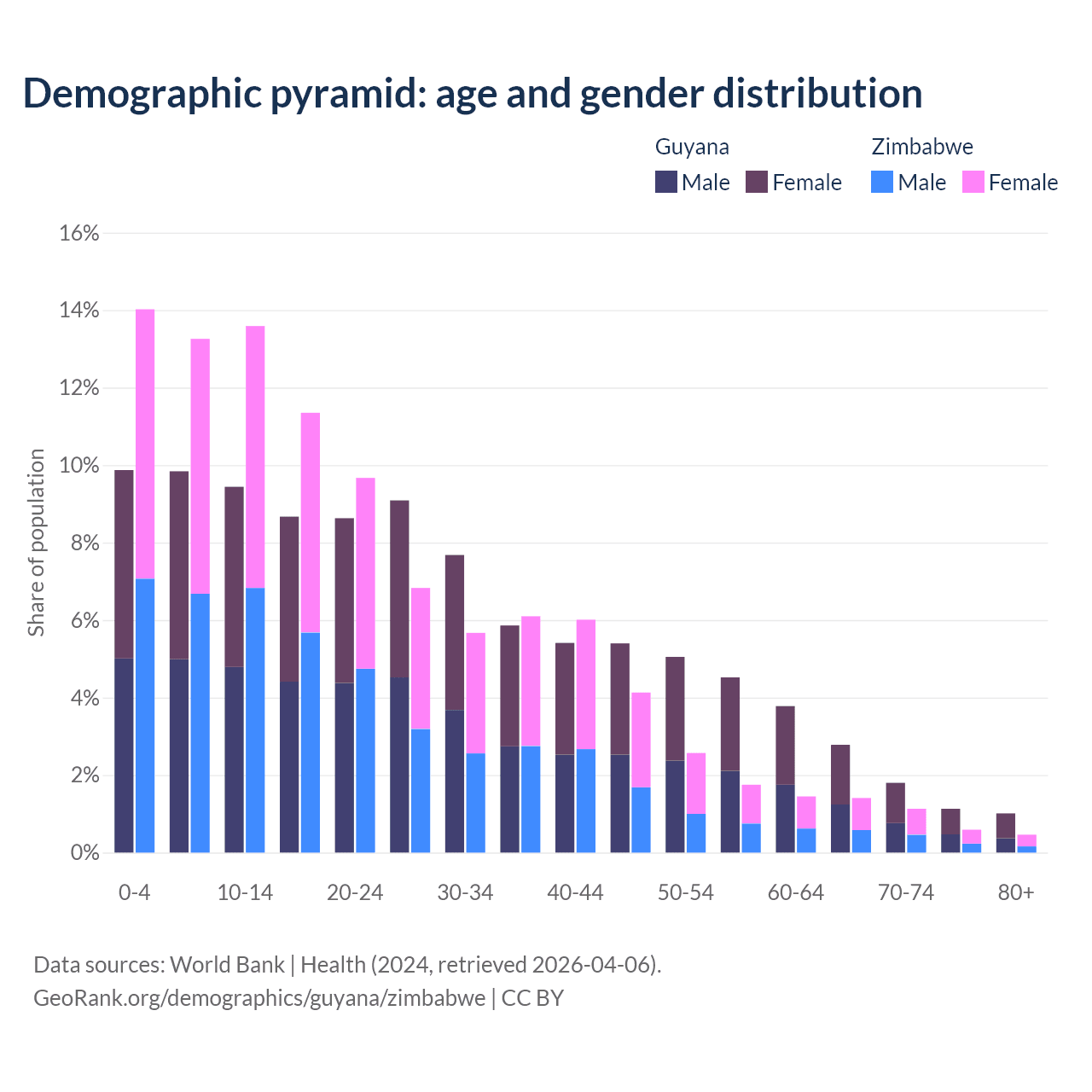 The share of older people aged 65 and over is 6.73% in Guyana and 3.6% in Zimbabwe. Life expectancy in Guyana compared to Zimbabwe .