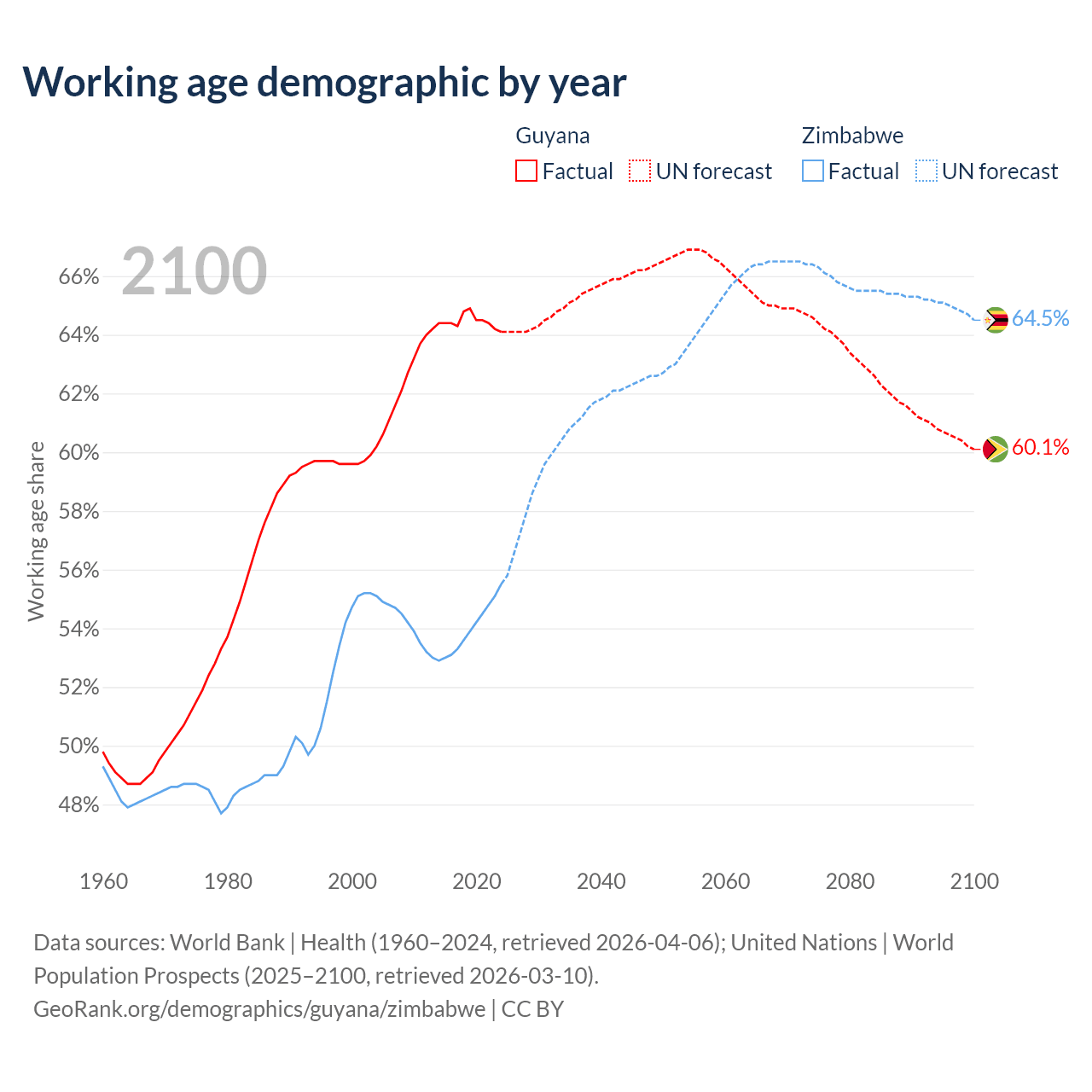 Median age Guyana vs Zimbabwe, 1960-2100