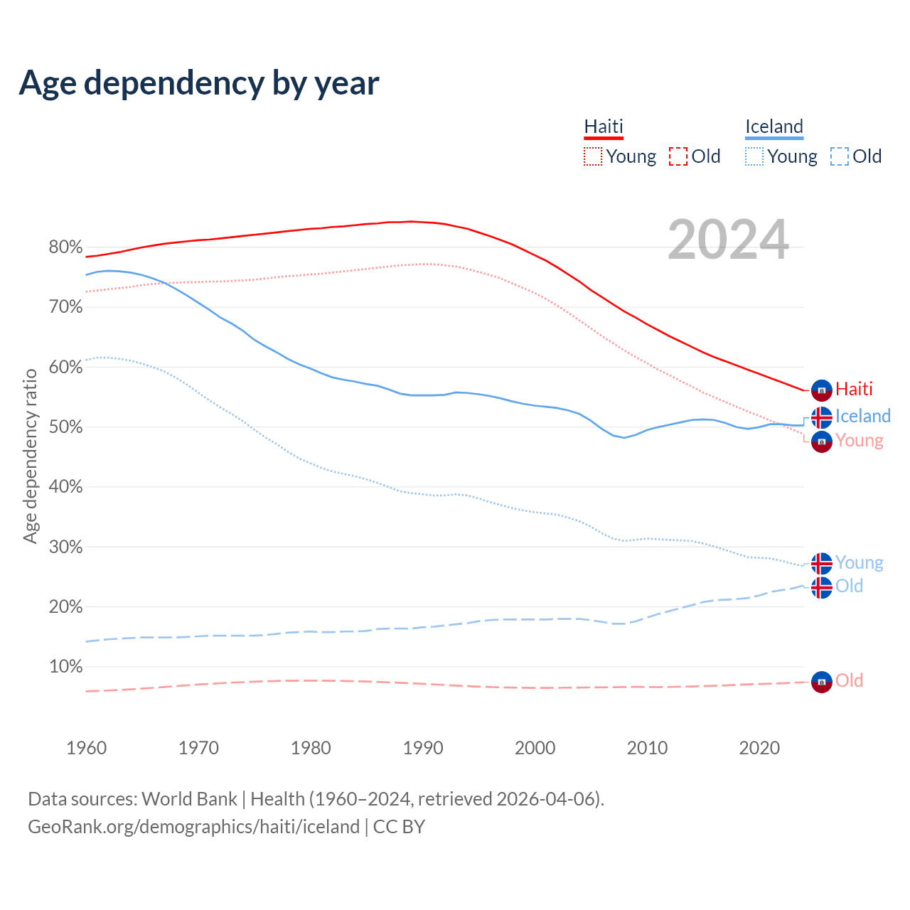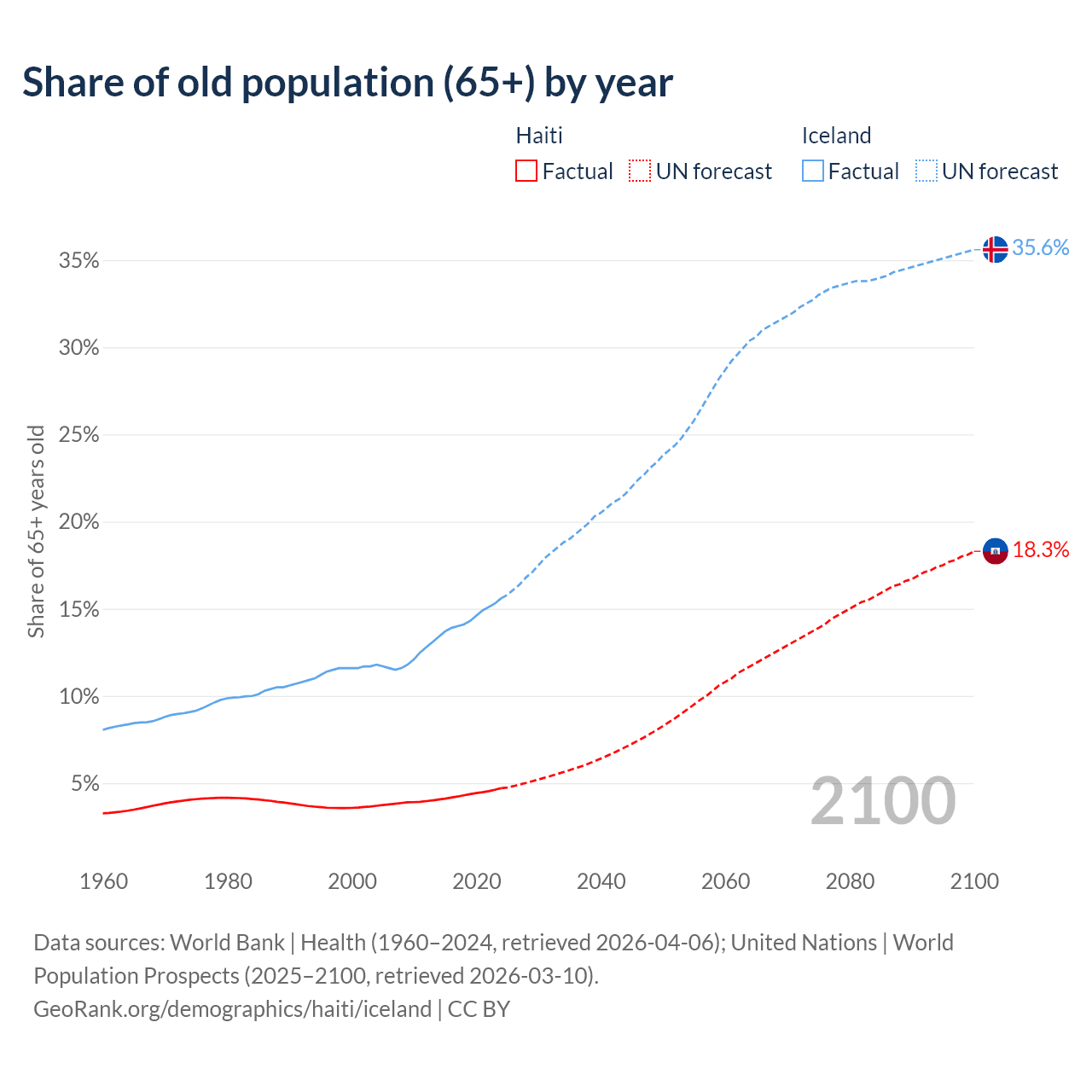 - The share of old-age demographic (65+) in Haiti is 4.71% vs 15.6% in Iceland.