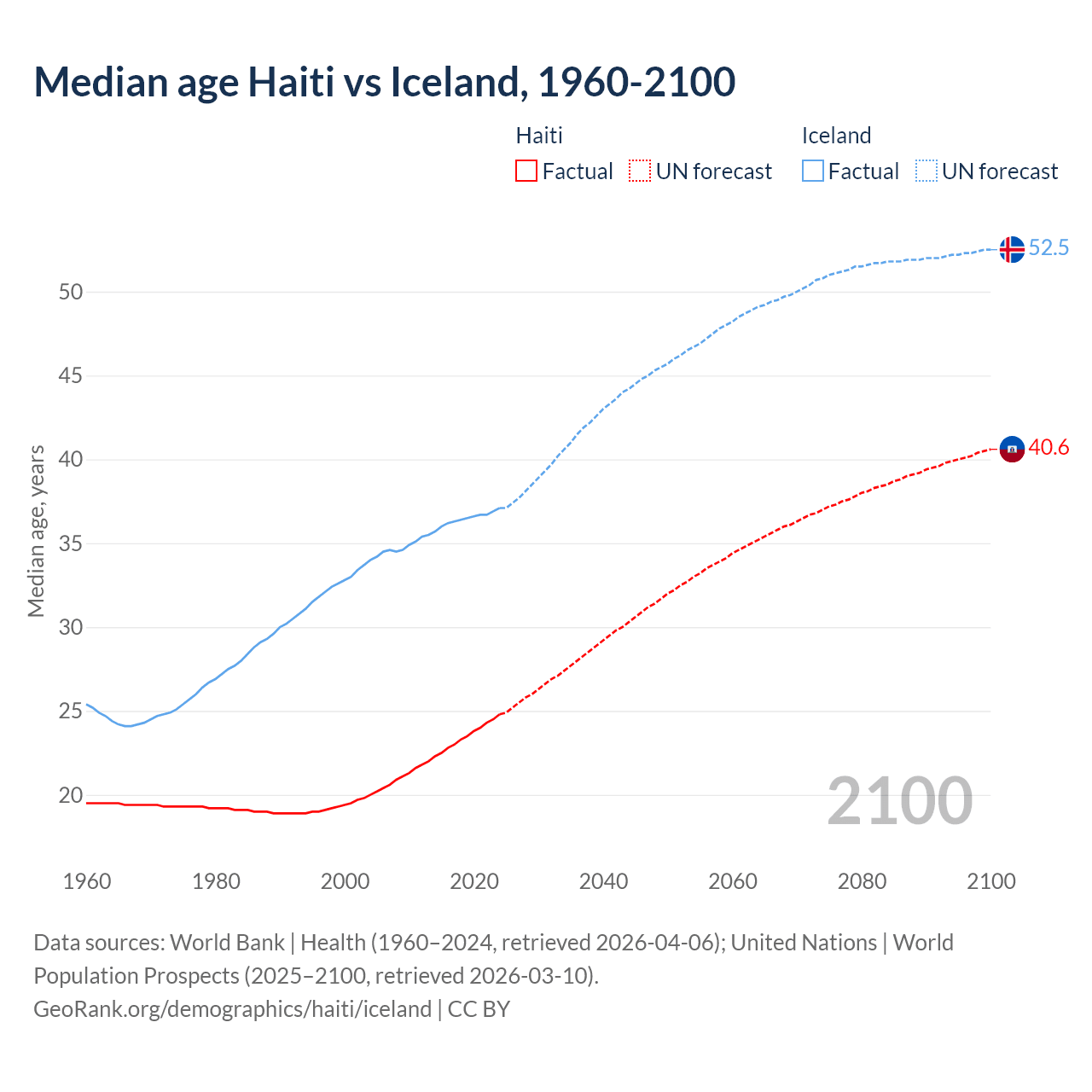 - The median age in Haiti is 24.8 years compared to 37.1 years in Iceland.
