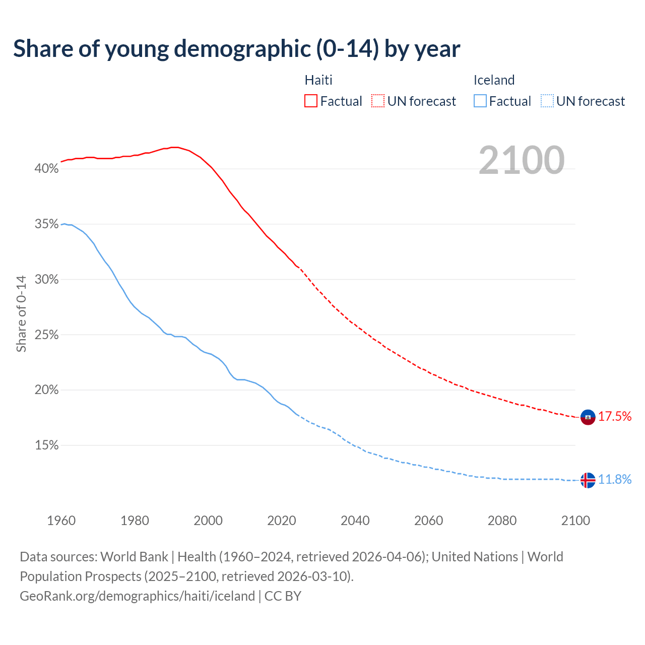 - The share of young demographic (0-15 years old) in Haiti is 31.2% vs 17.8% in Iceland.