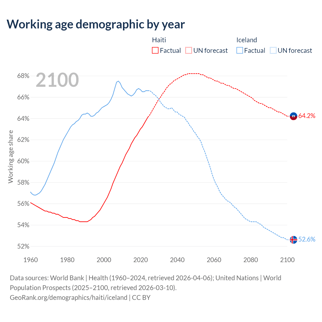 - Haiti has 7.74M working age adults (aged 15-64) vs 264K in Iceland.