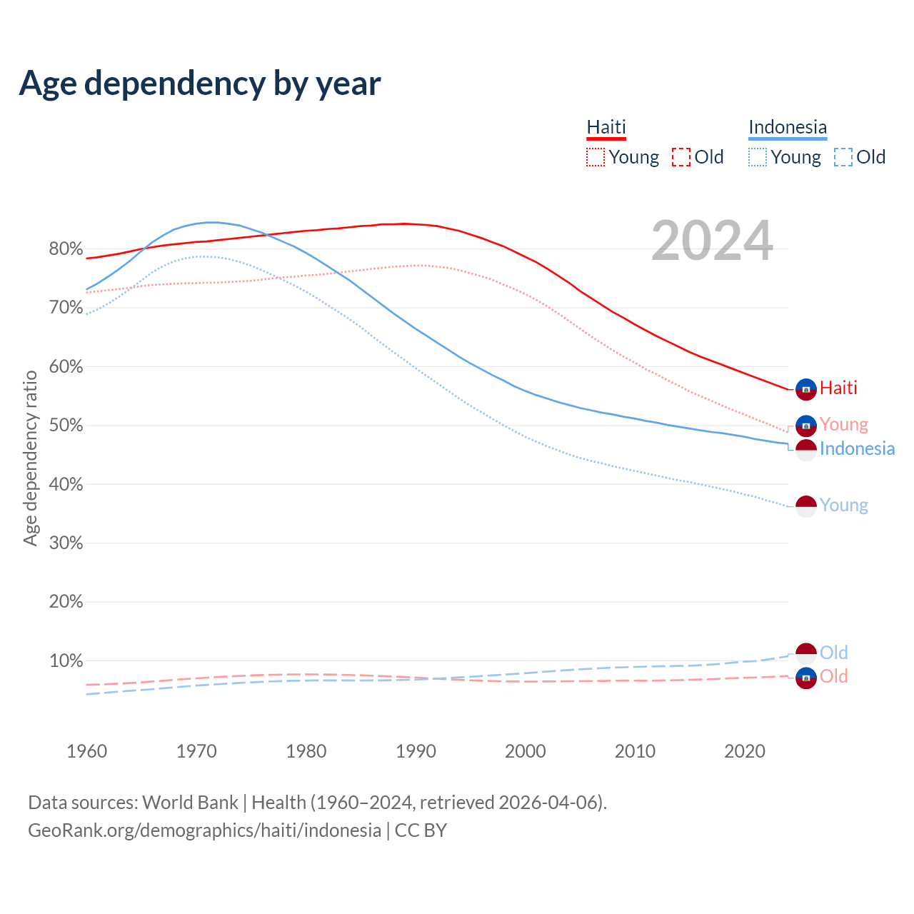 - Haiti is ranked 135/196 by median age (oldest to youngest) vs 93/196 for Indonesia.