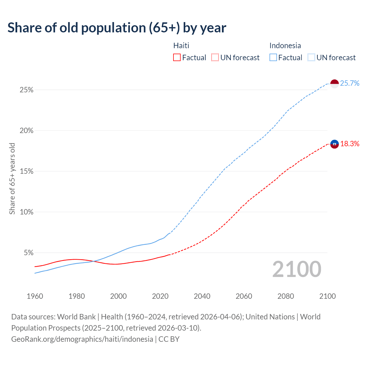 - The share of old-age demographic (65+) in Haiti is 4.71% vs 7.29% in Indonesia.