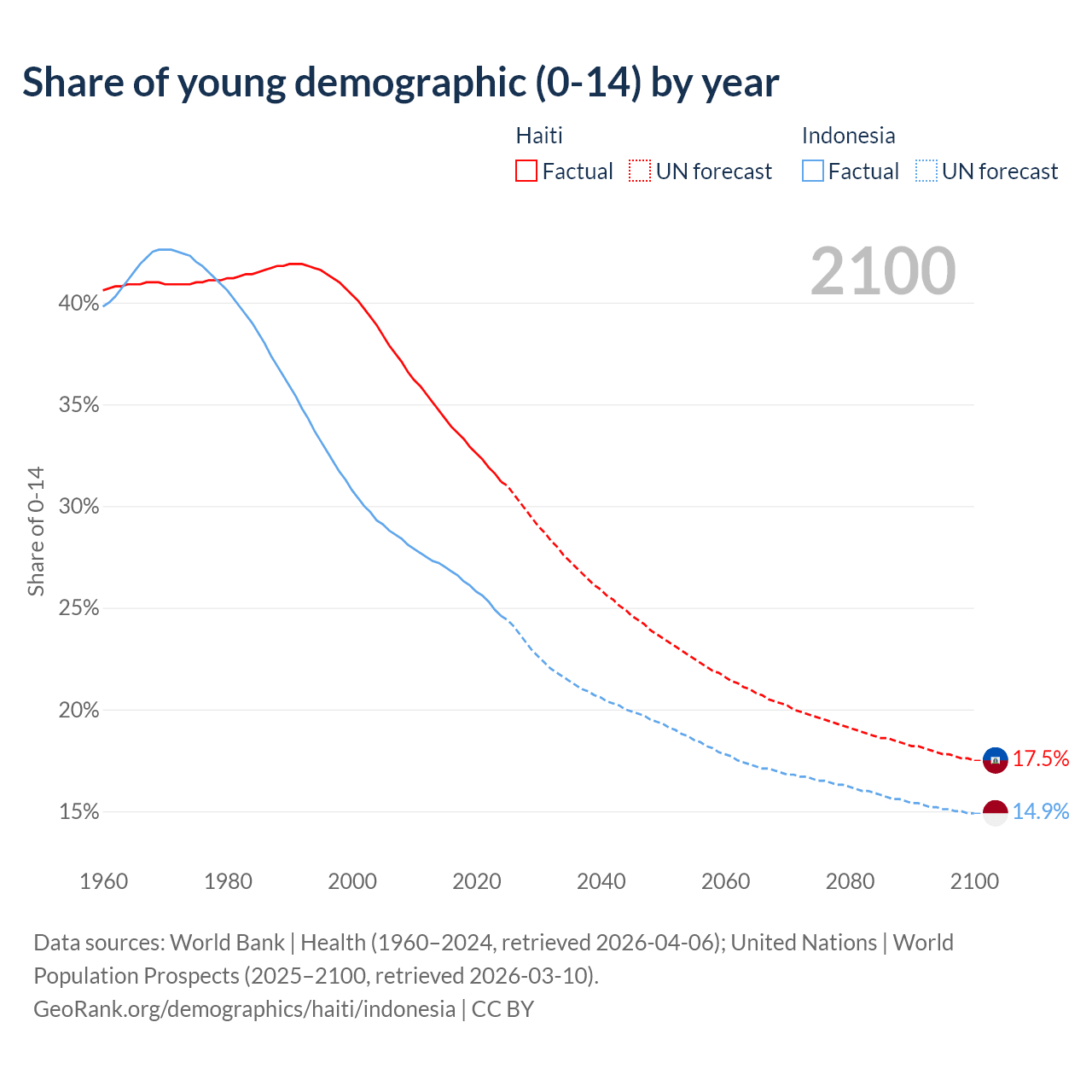 - The share of young demographic (0-15 years old) in Haiti is 31.2% vs 24.6% in Indonesia.