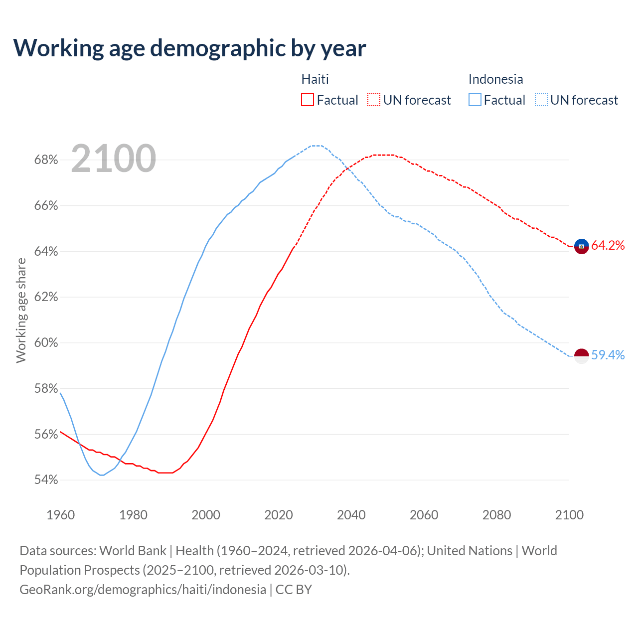 - Haiti has 7.74M working age adults (aged 15-64) vs 197M in Indonesia.