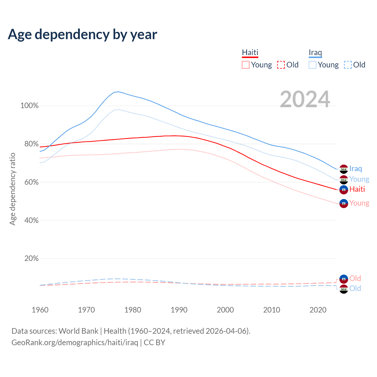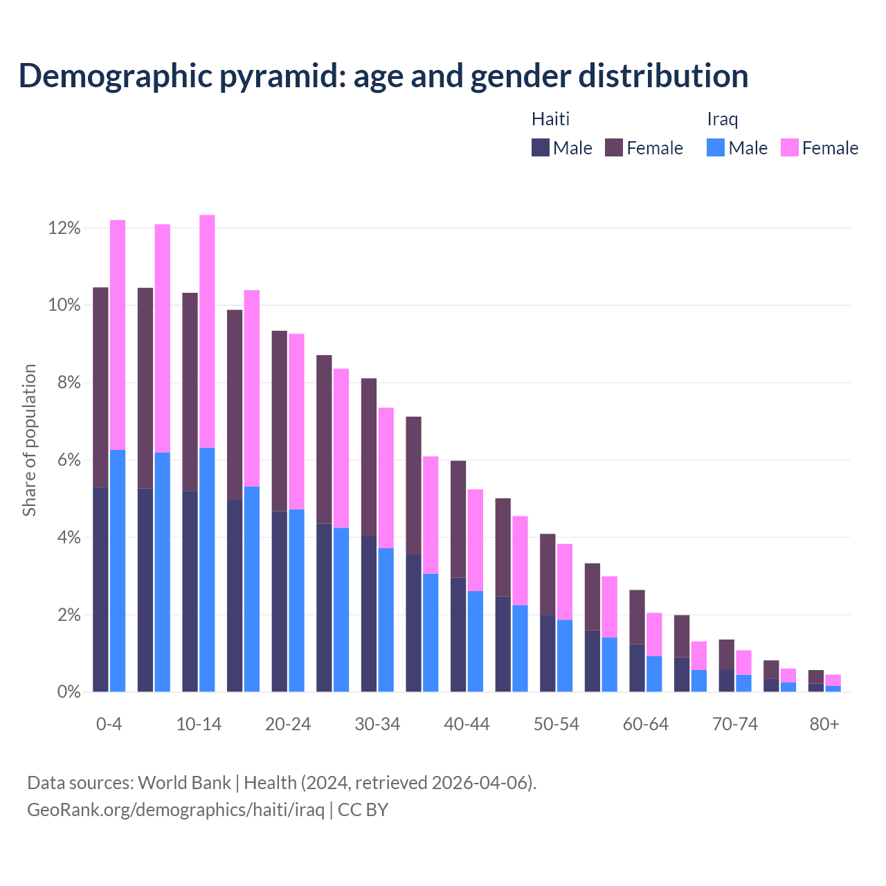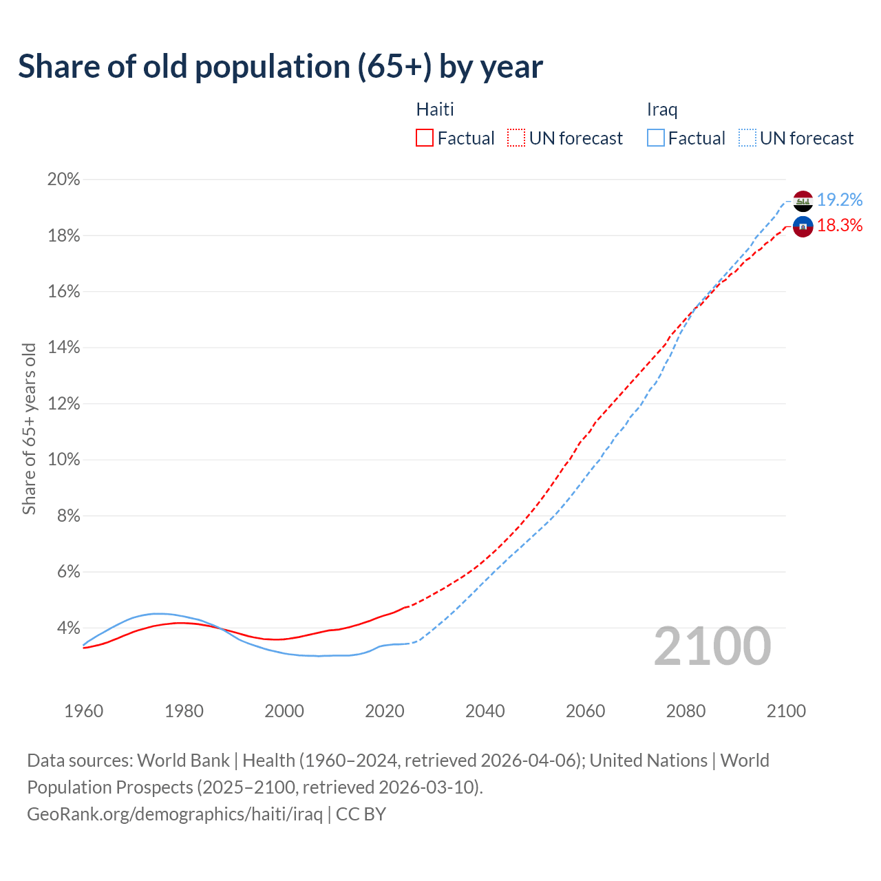 - The share of old-age demographic (65+) in Haiti is 4.71% vs 3.41% in Iraq.