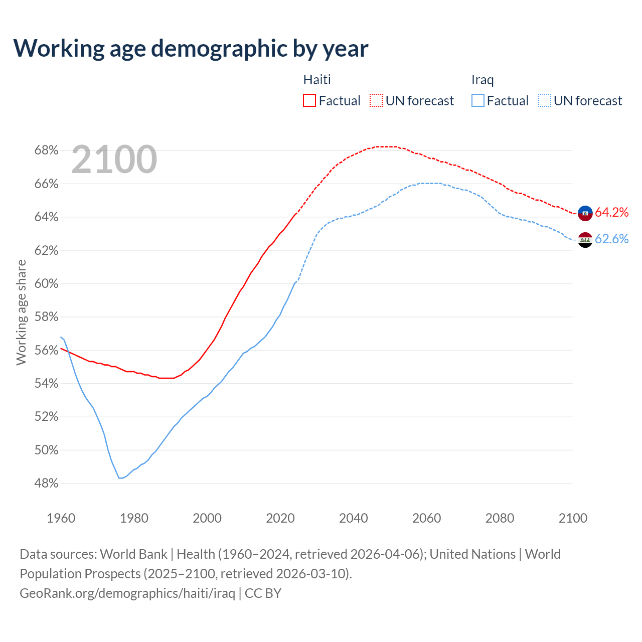 The share of older people aged 65 and over is 4.71% in Haiti and 3.41% in Iraq. Life expectancy in Haiti compared to Iraq .