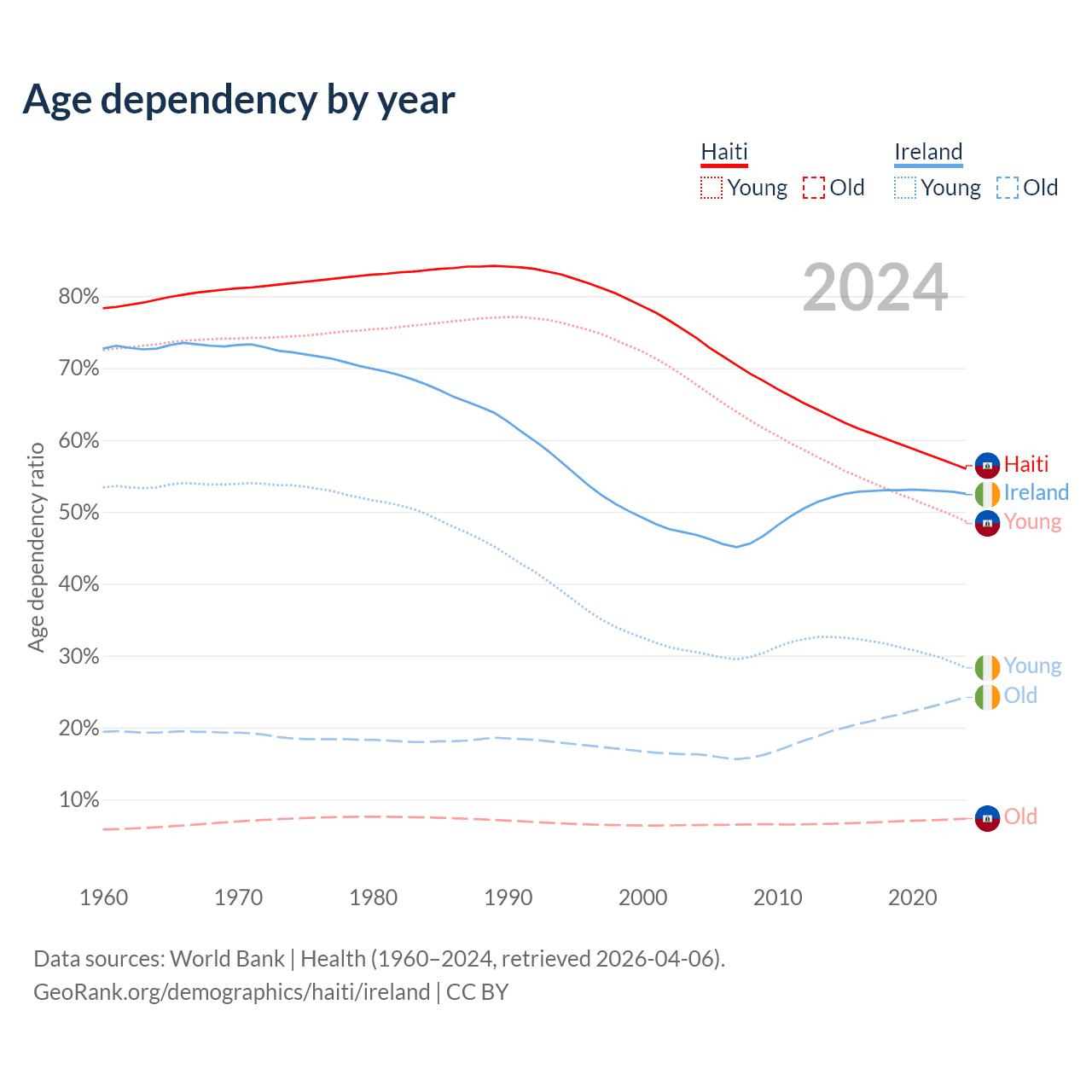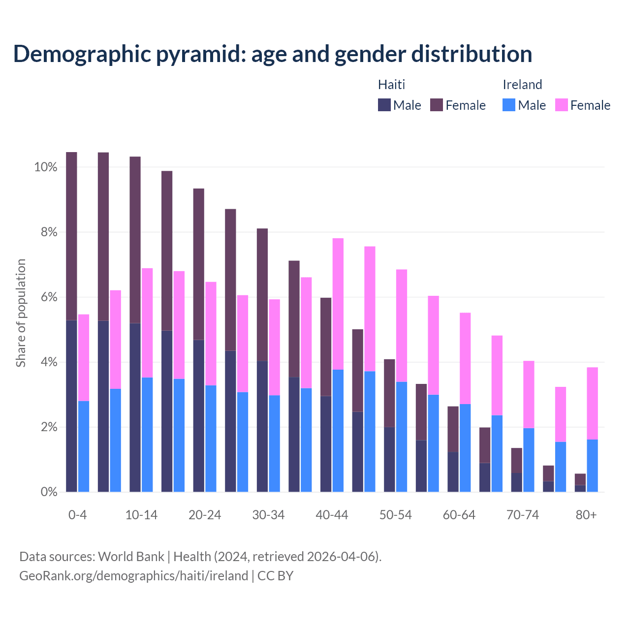 - The share of old-age demographic (65+) in Haiti is 4.71% vs 15.9% in Ireland.