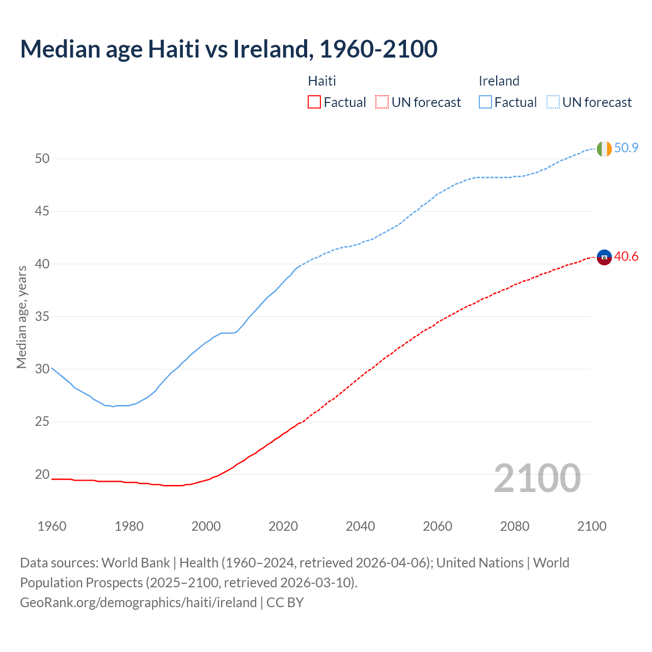 Median age Haiti vs Ireland, 1960-2100