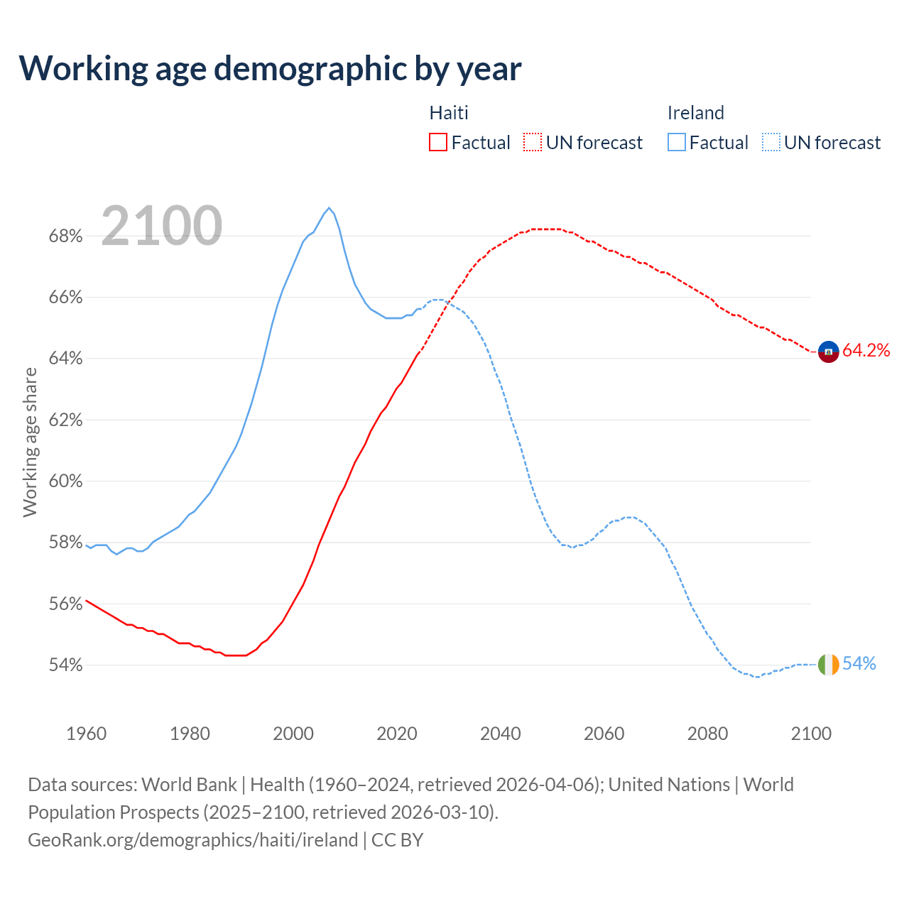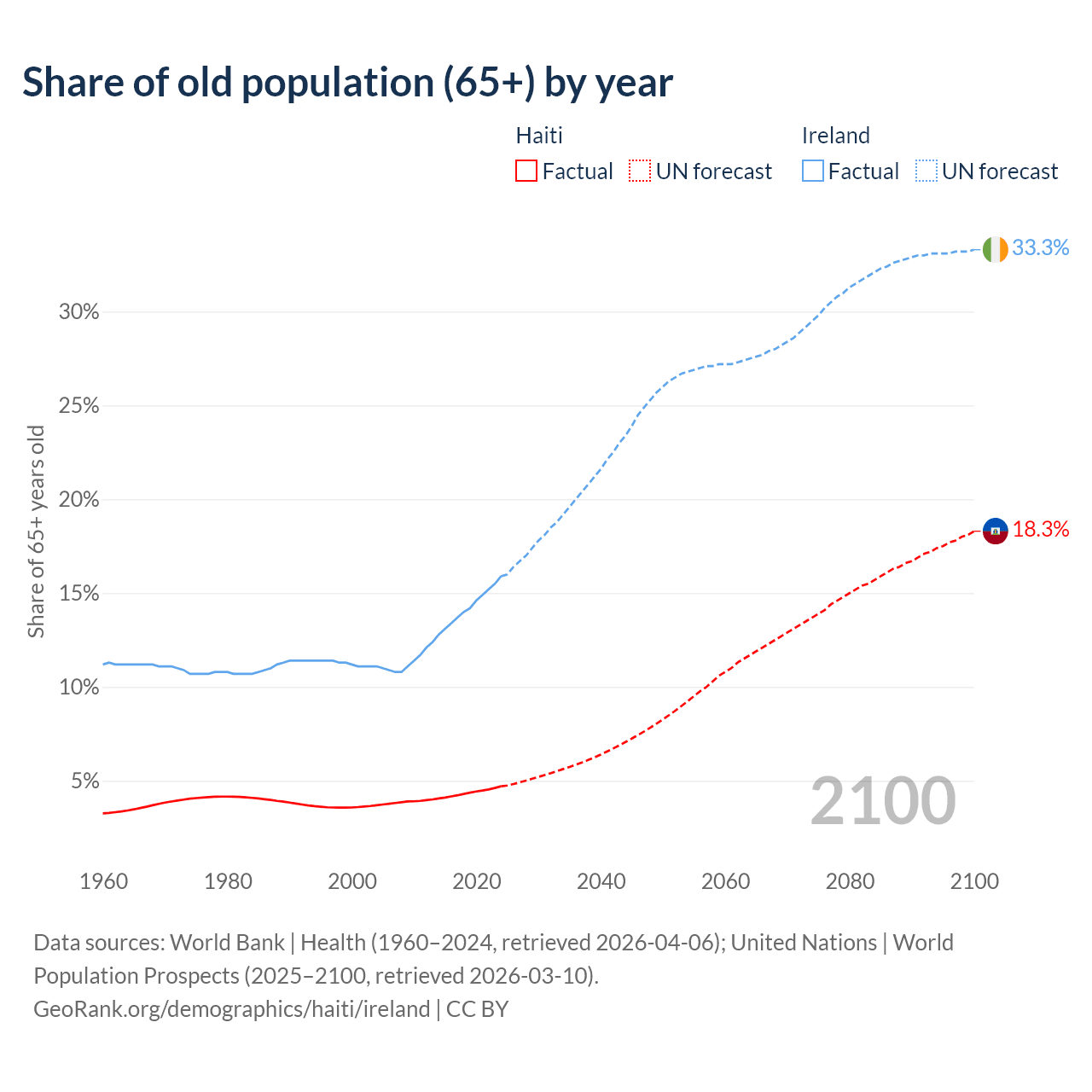 The share of older people aged 65 and over is 4.71% in Haiti and 15.9% in Ireland. Life expectancy in Haiti compared to Ireland .