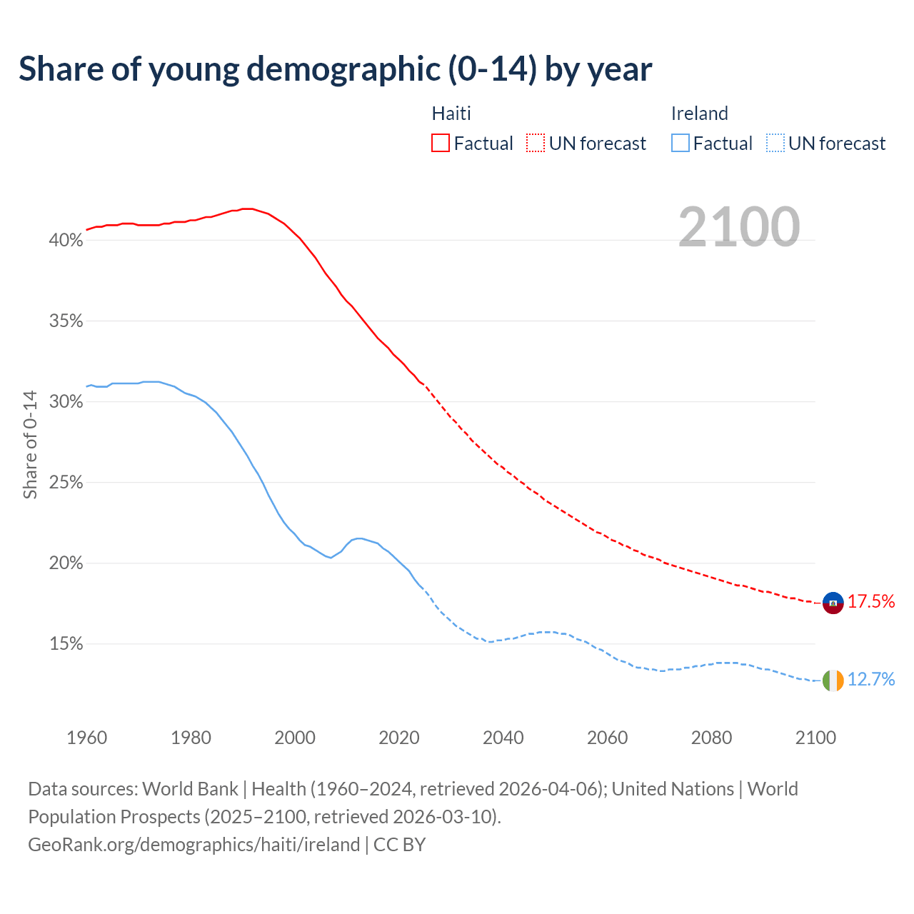 - The share of young demographic (0-15 years old) in Haiti is 31.2% vs 18.6% in Ireland.