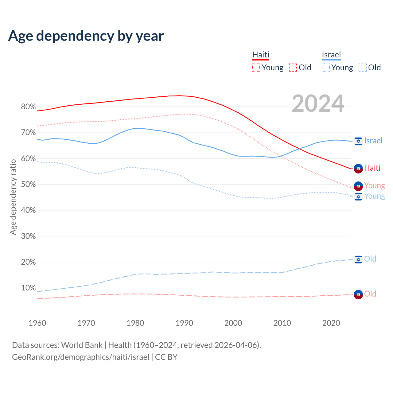- Haiti is ranked 135/196 by median age (oldest to youngest) vs 103/196 for Israel.