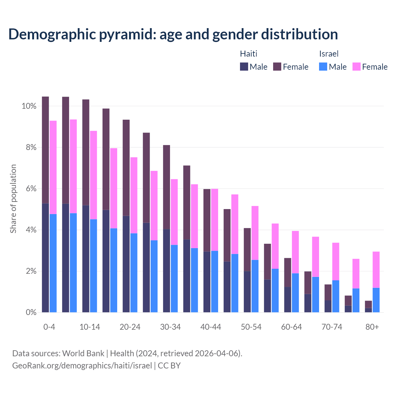 - The median age in Haiti is 24.8 years compared to 30.2 years in Israel.