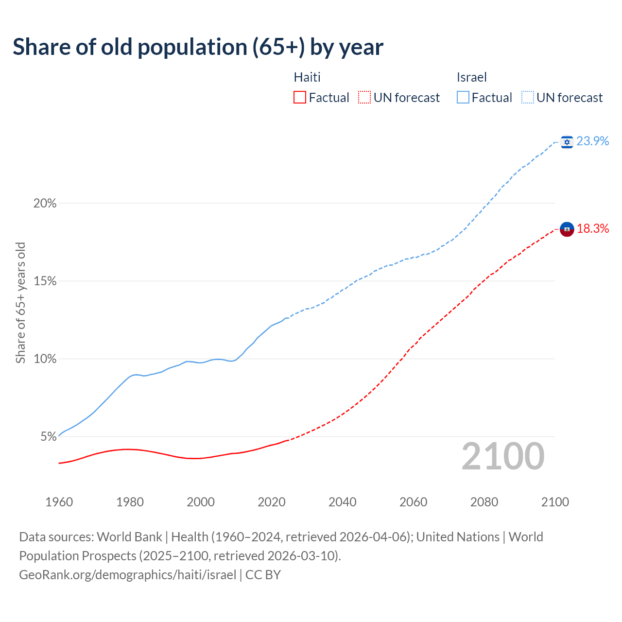 The share of older people aged 65 and over is 4.71% in Haiti and 12.6% in Israel. Life expectancy in Haiti compared to Israel .