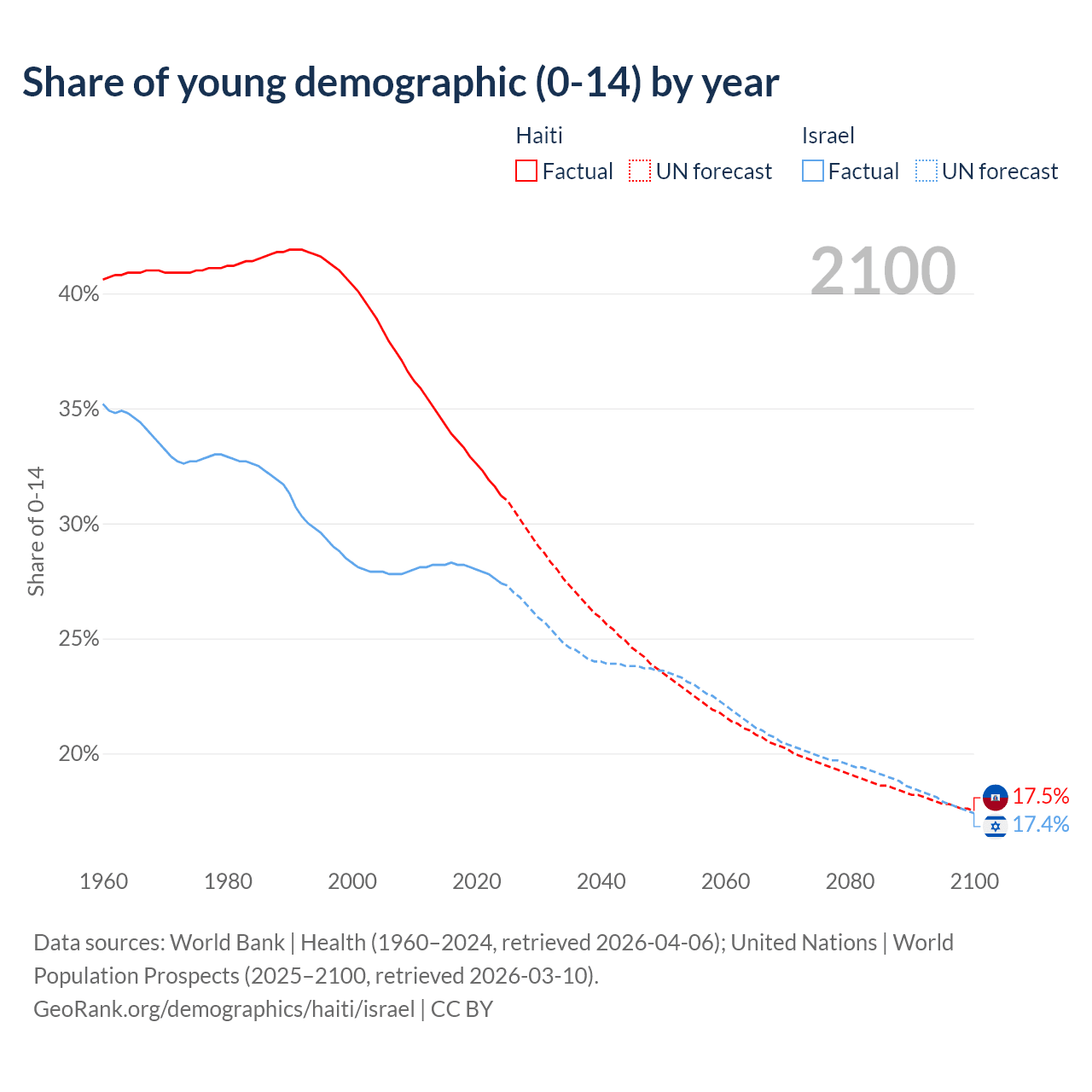 - The share of young demographic (0-15 years old) in Haiti is 31.2% vs 27.4% in Israel.