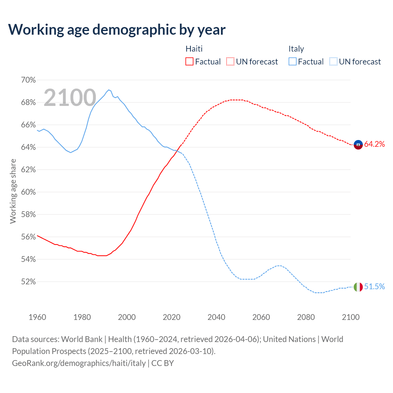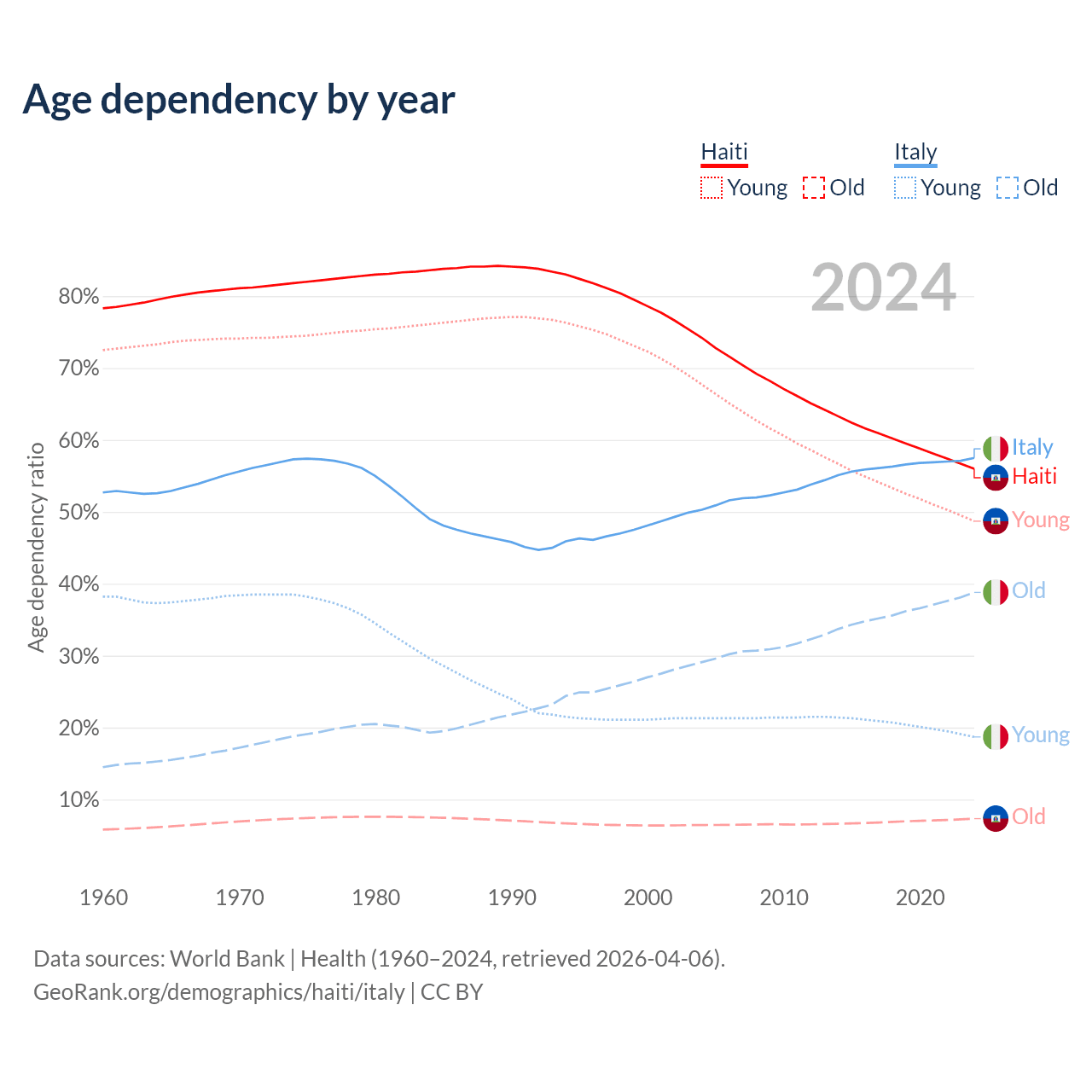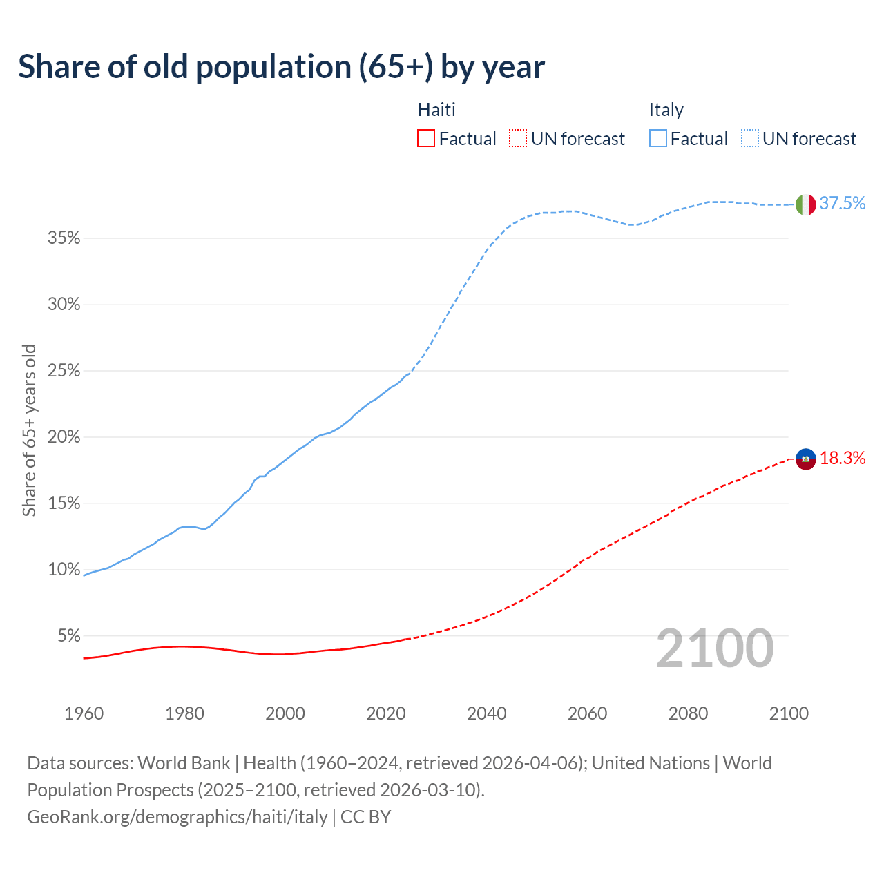 The share of older people aged 65 and over is 4.71% in Haiti and 24.6% in Italy. Life expectancy in Haiti compared to Italy .