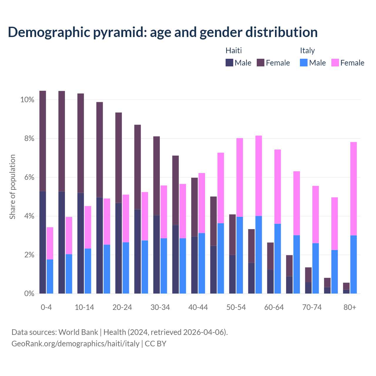 - The share of old-age demographic (65+) in Haiti is 4.71% vs 24.6% in Italy.