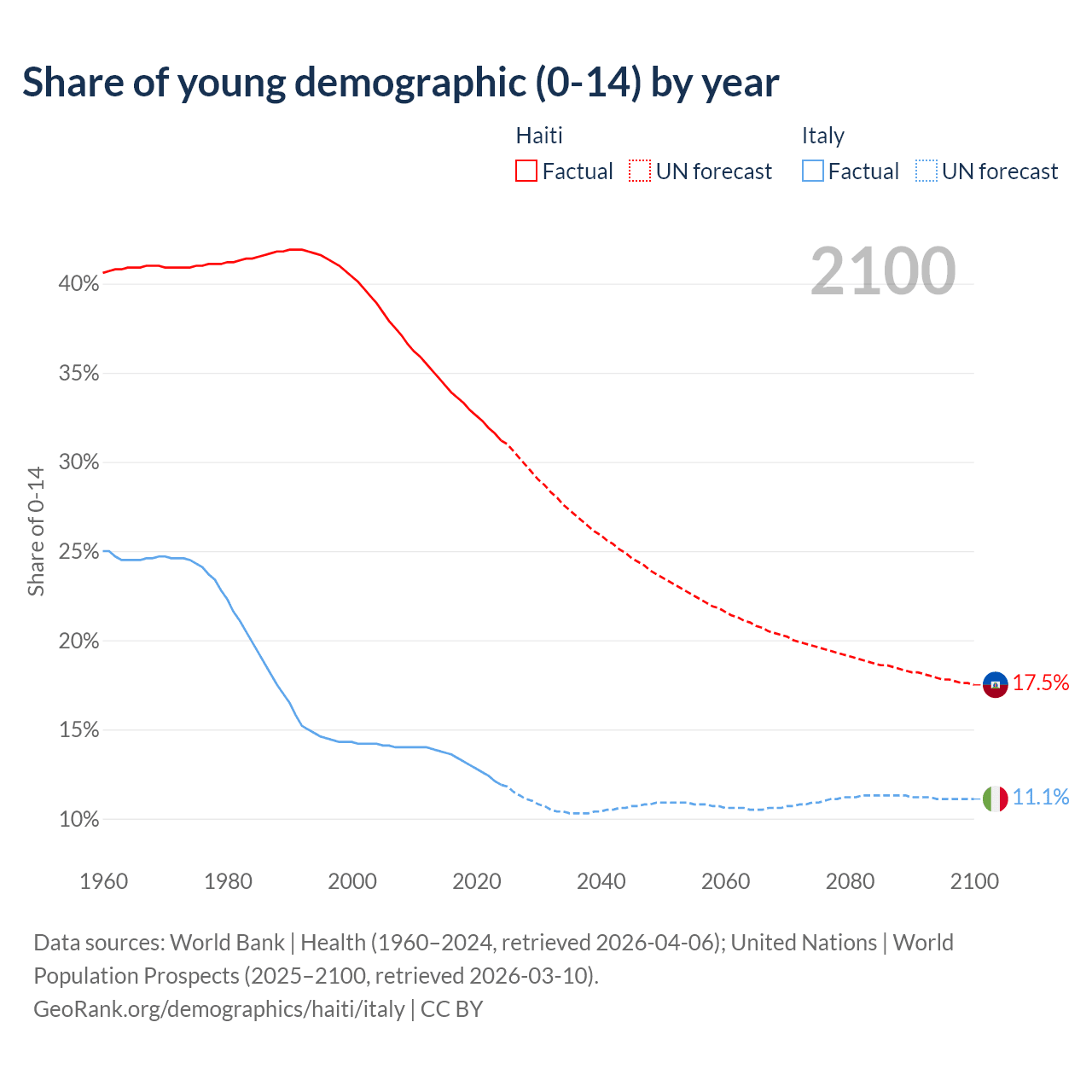 - The share of young demographic (0-15 years old) in Haiti is 31.2% vs 11.9% in Italy.