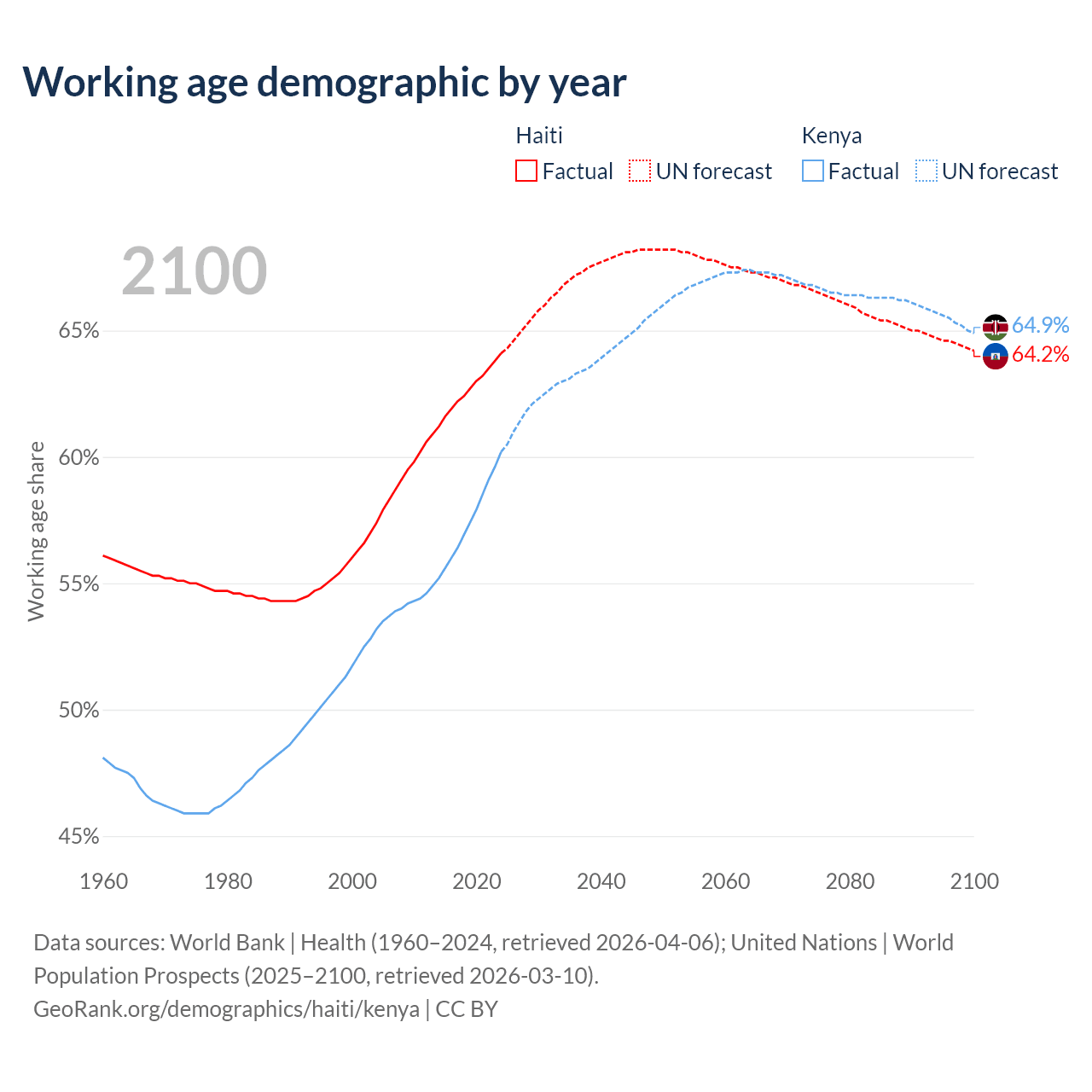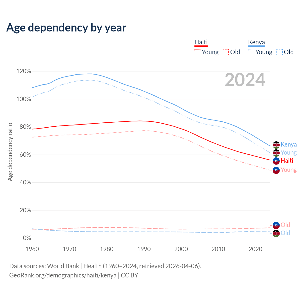 - The share of old-age demographic (65+) in Haiti is 4.71% vs 2.97% in Kenya.